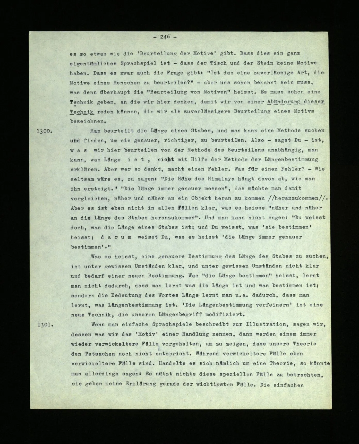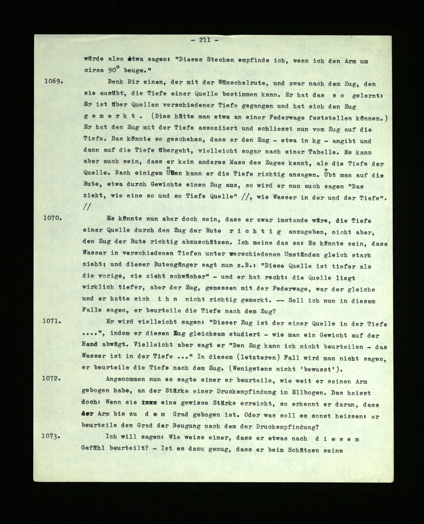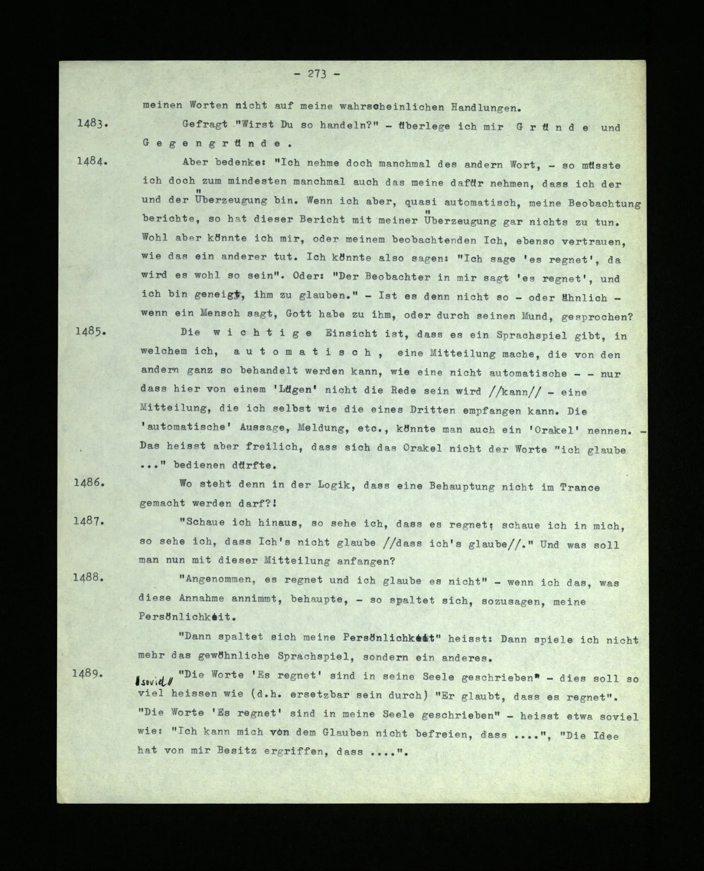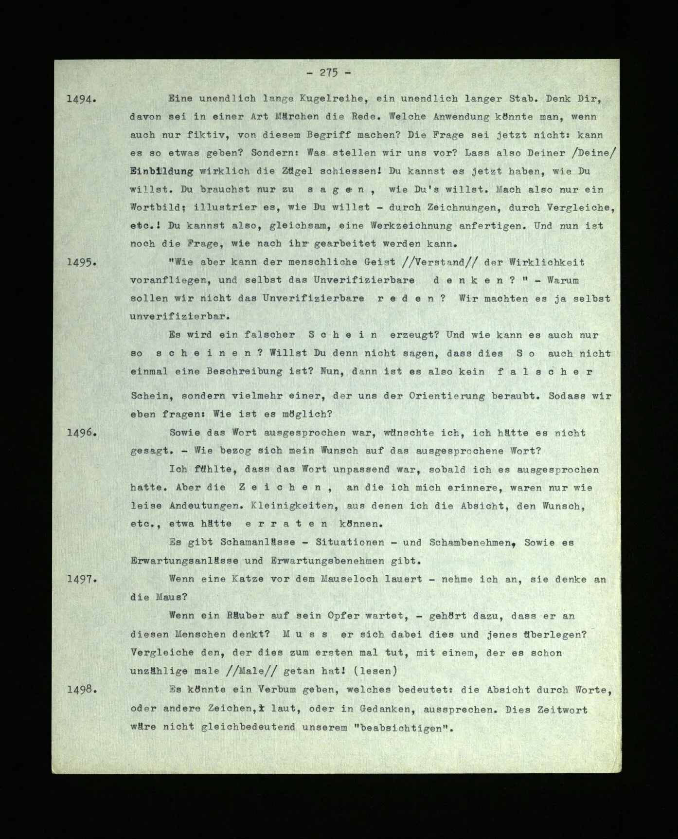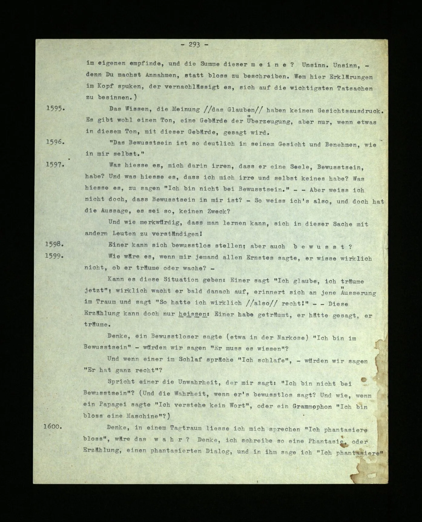 1801. Er fragt “Was hast Du mit dem Wort gemeint?” – Ich beantworte die Frage und setze hinzu: “Hättest Du mich früher gefragt, so hätte ich das gleiche geantwortet; meine Antwort war nicht eine Deutung, die mir jetzt eingefallen ist.” So war sie mir schon früher eingefallen? Nein. – Und wie konnte ich dann sagen: “Hättest Du mich früher gefragt, so hätte ich ‥‥”? Woraus schloß ich das? Aus gar nichts. Was teile ich ihm mit, wenn ich diesen Konditional ausspreche? Etwas, was manchmal von Wichtigkeit sein kann.
