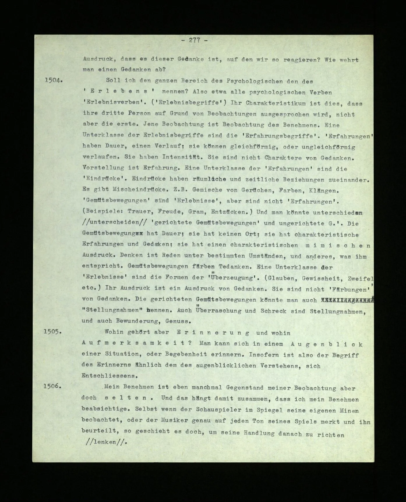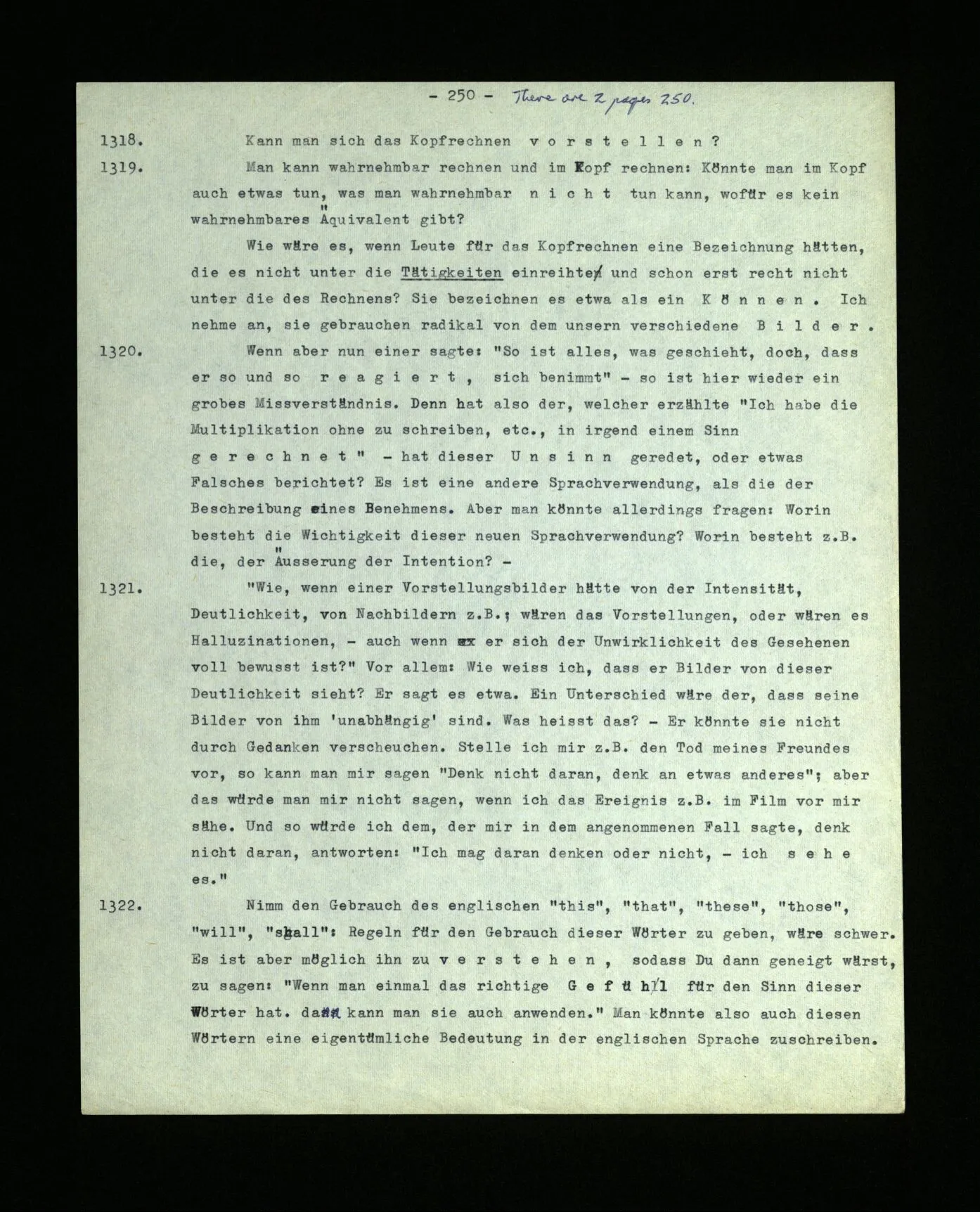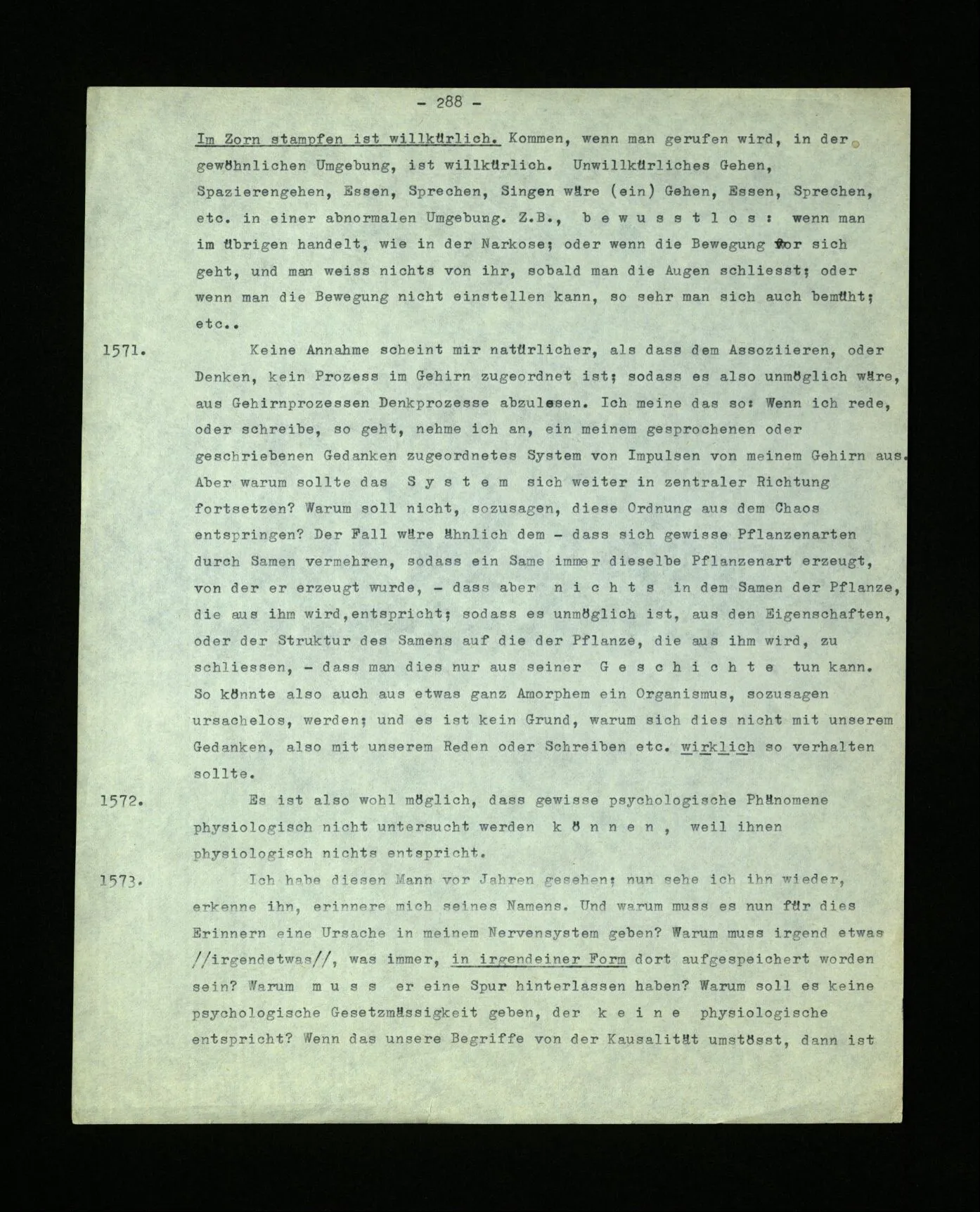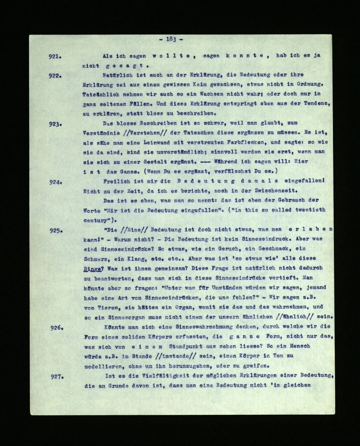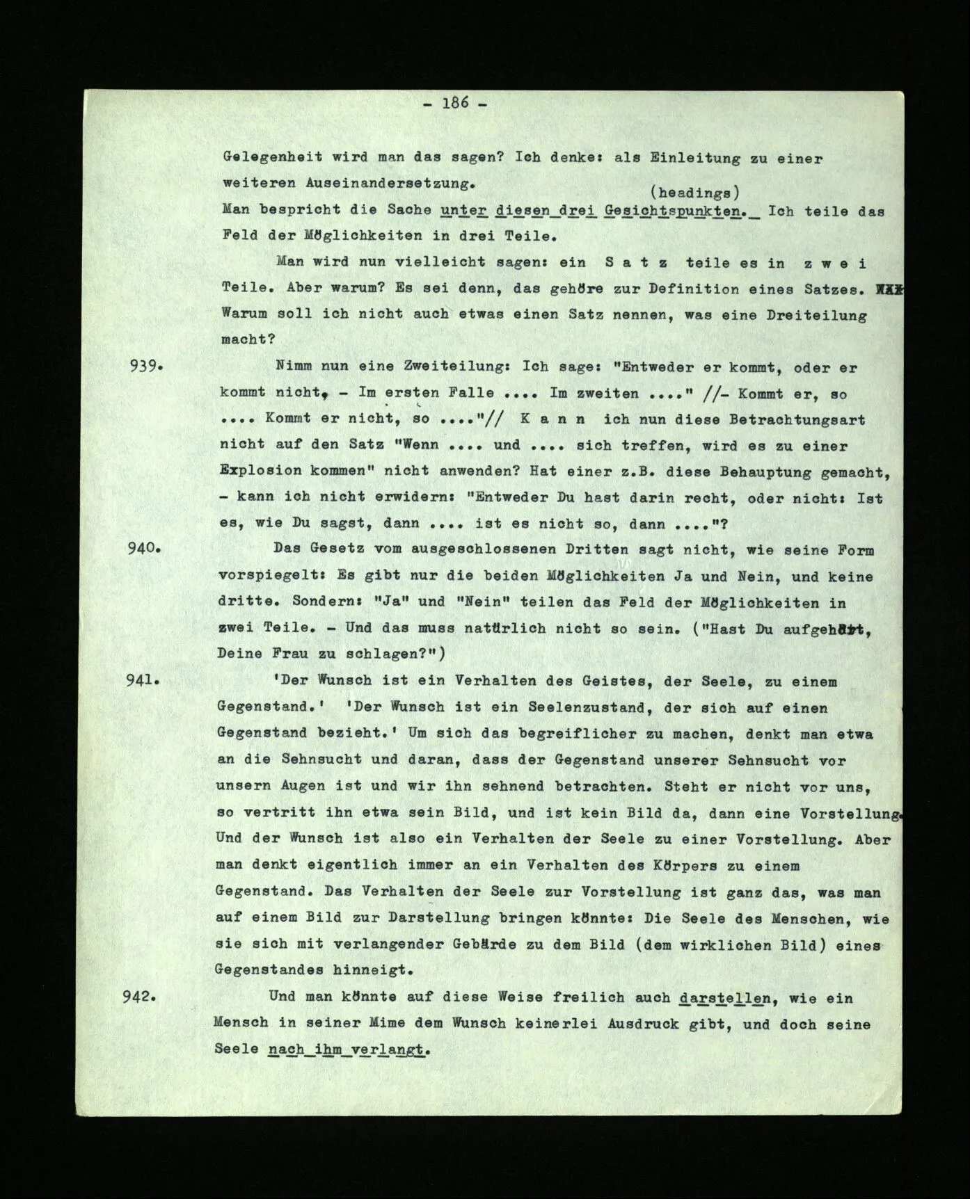 1801. Er fragt “Was hast Du mit dem Wort gemeint?” – Ich beantworte die Frage und setze hinzu: “Hättest Du mich früher gefragt, so hätte ich das gleiche geantwortet; meine Antwort war nicht eine Deutung, die mir jetzt eingefallen ist.” So war sie mir schon früher eingefallen? Nein. – Und wie konnte ich dann sagen: “Hättest Du mich früher gefragt, so hätte ich ‥‥”? Woraus schloß ich das? Aus gar nichts. Was teile ich ihm mit, wenn ich diesen Konditional ausspreche? Etwas, was manchmal von Wichtigkeit sein kann.