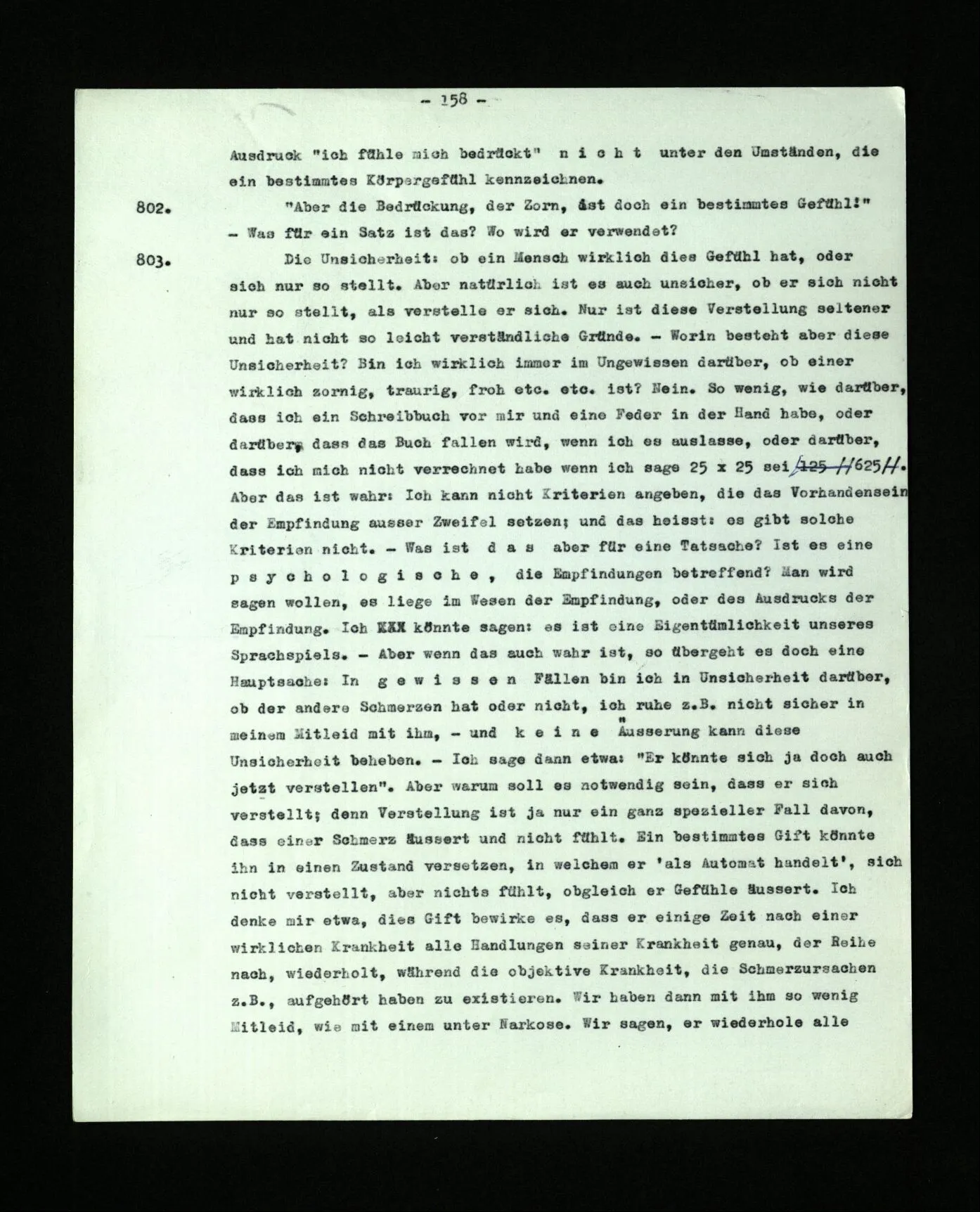 1802. Er weiß z.B. jetzt, daß keine Sinnesänderung in mir vorgegangen ist. Es macht auch einen Unterschied, ob ich antworte, ich hätte die Worte ‘nur so vor mich hin gesagt’, ohne etwas mit ihnen zu meinen; oder, ich habe den und den mit ihnen gemeint. Es hängt manches davon ab. Es ist auch nicht gleichgültig ob jemand mir sagt “Ich liebe sie”, weil ihm die Worte eines Gedichts im Kopf herumgehen, oder ob er’s sagt, mir seine Liebe zu gestehen.