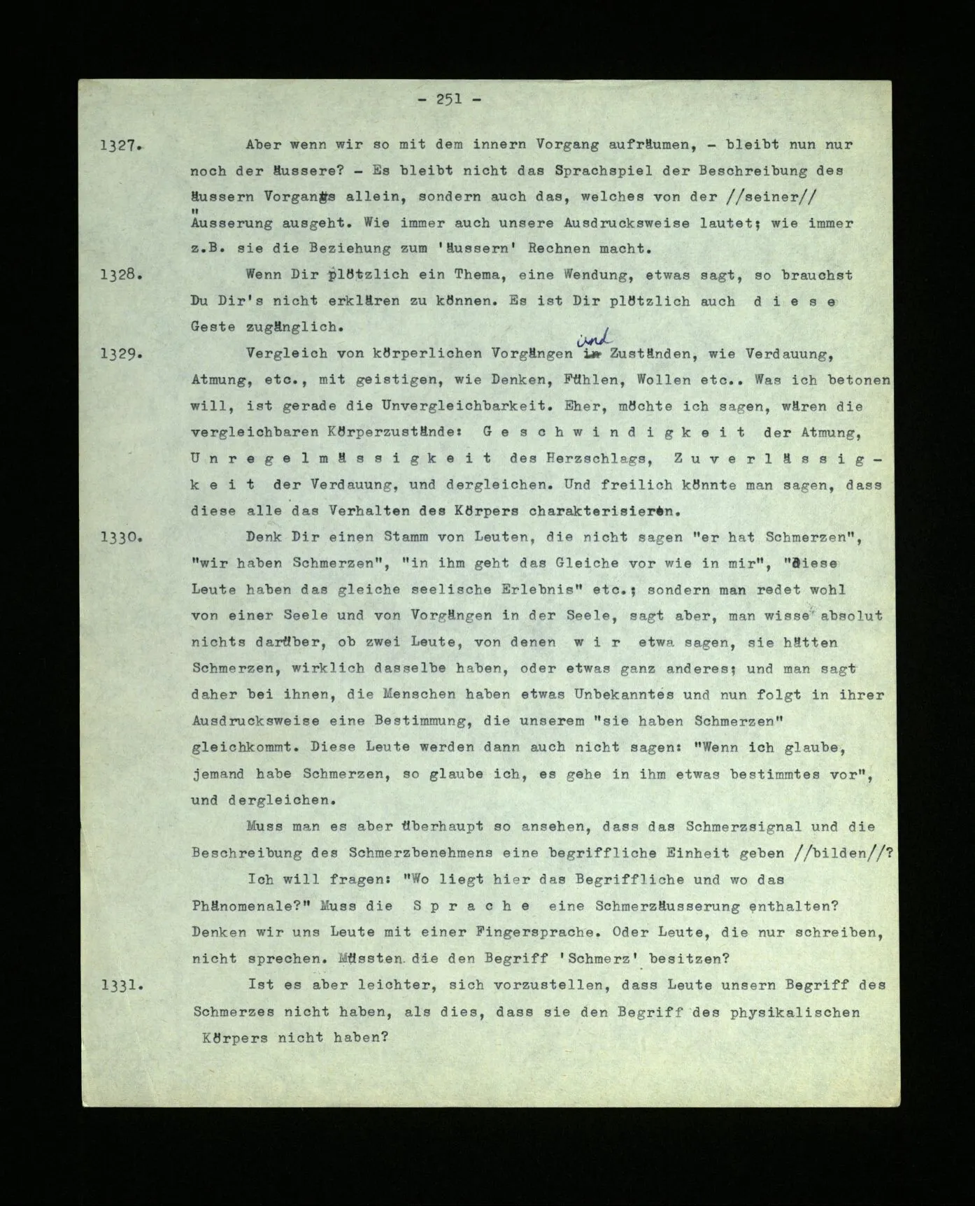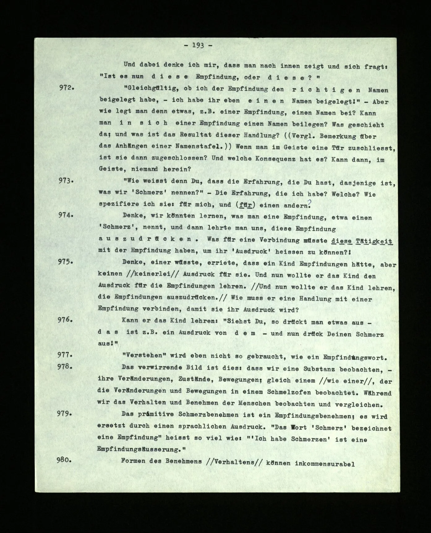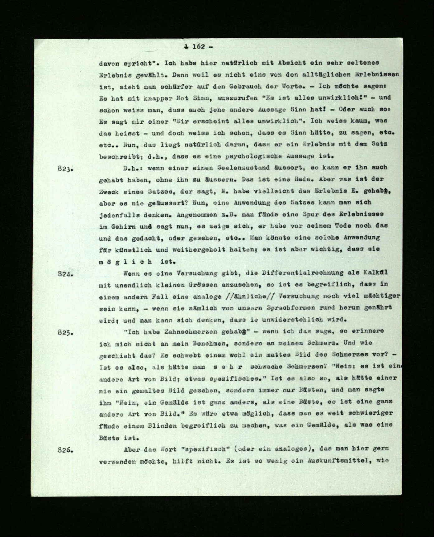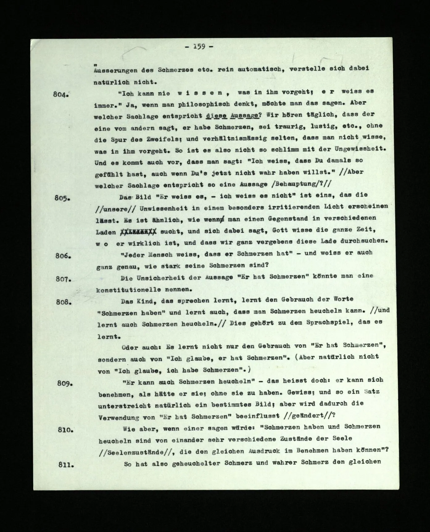 1800. Du mußt mit der Vorstellung Ernst machen, daß es ja wirklich in einer Sprache ein Wort geben könnte, welches Schmerzbenehmen, und nicht Schmerz, bezeichnet.
