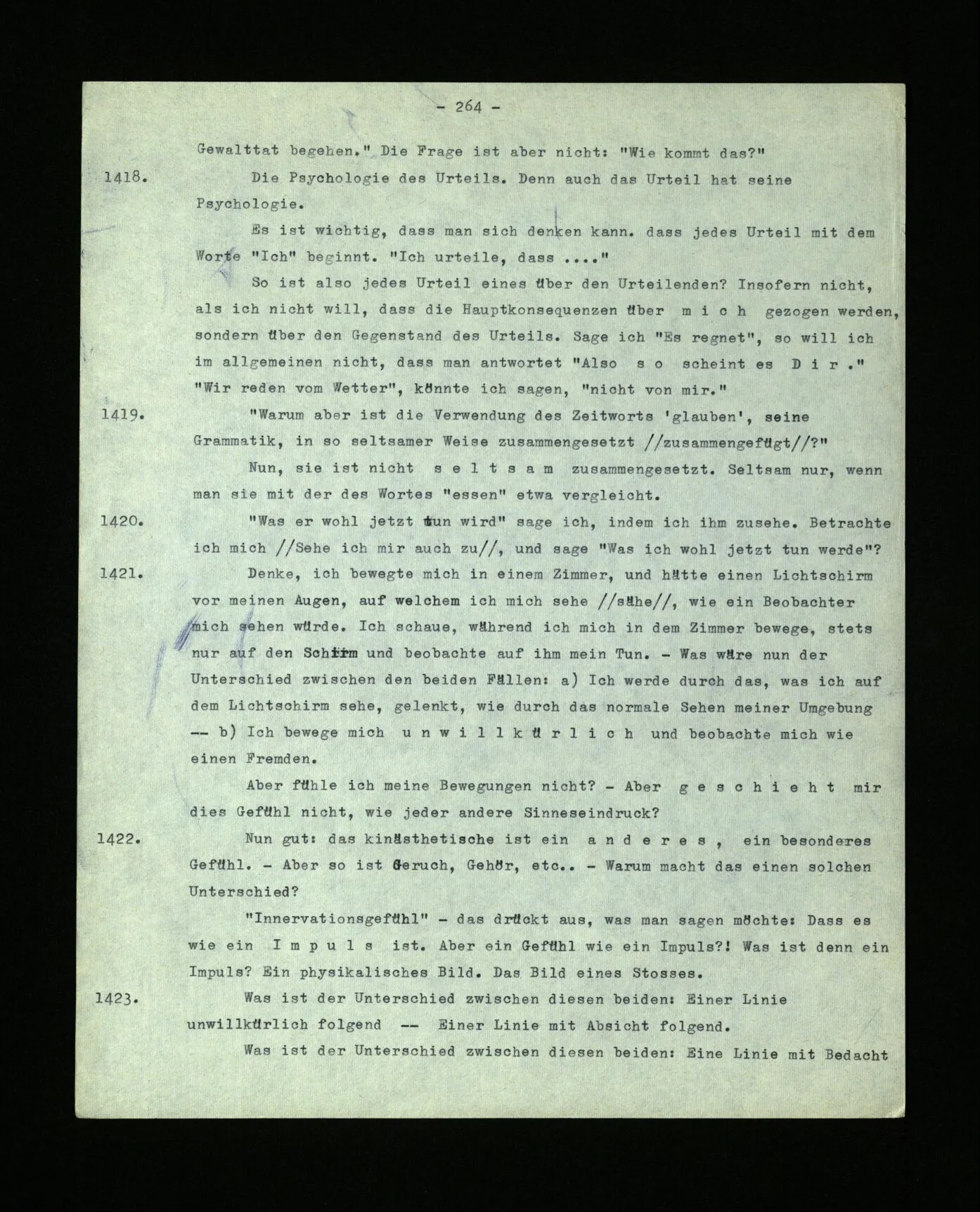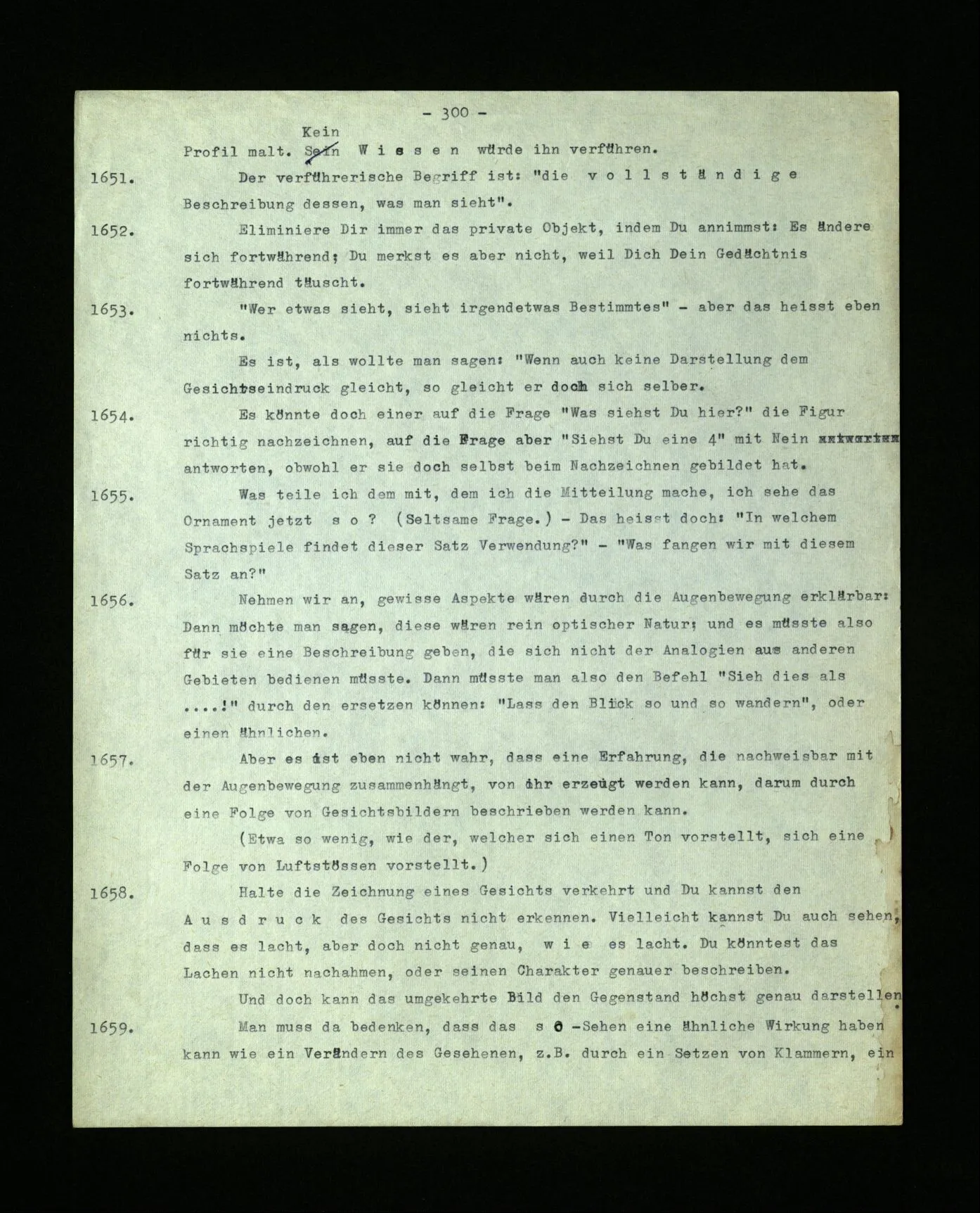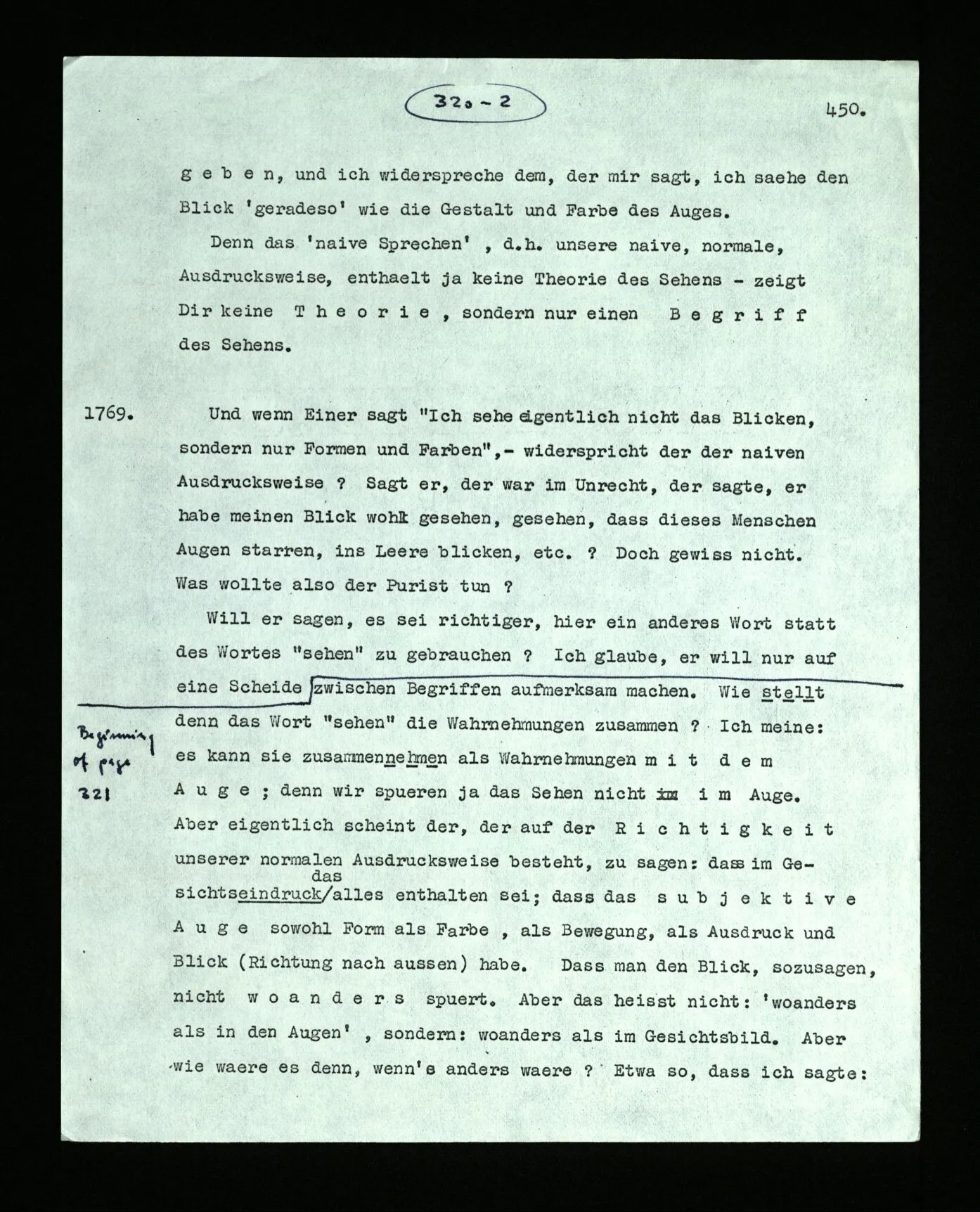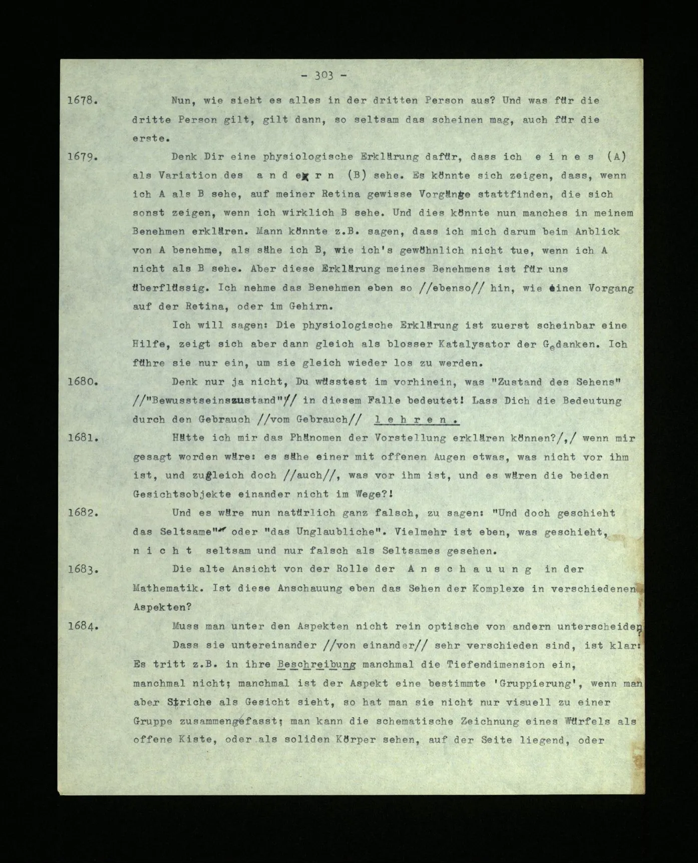 1768. “Wenn Du nur von Deinen physiologischen Vorurteilen wegkommst, wirst Du garnichts daran finden, daß das Blicken des Auges auch gesehen werden kann.” Ich sage ja auch, ich sehe den Blick, den Du dem Andern zuwirfst. Und wollte man mich verbessern und sagen, ich sähe ihn eigentlich nicht, so hielte ich das für eine Dummheit. Anderseits habe ich mit meiner Redeweise nicht etwas zugegeben,, und ich widerspreche dem, der mir sagt, ich sähe den Blick ‘geradeso’ wie die Gestalt und Farbe des Auges. Denn das ‘naive Sprechen’, d.h. unsere naive, normale, Ausdrucksweise, enthält ja keine Theorie des Sehens – zeigt Dir keine Theorie, sondern nur einen Begriff des Sehens.