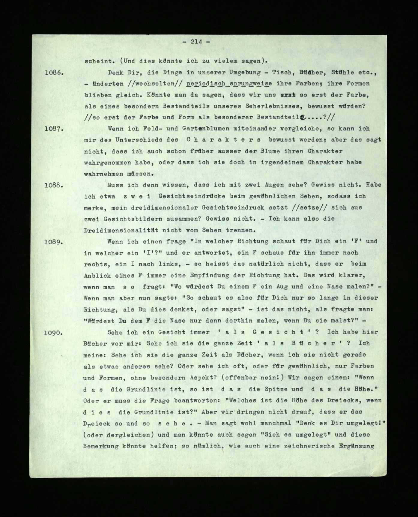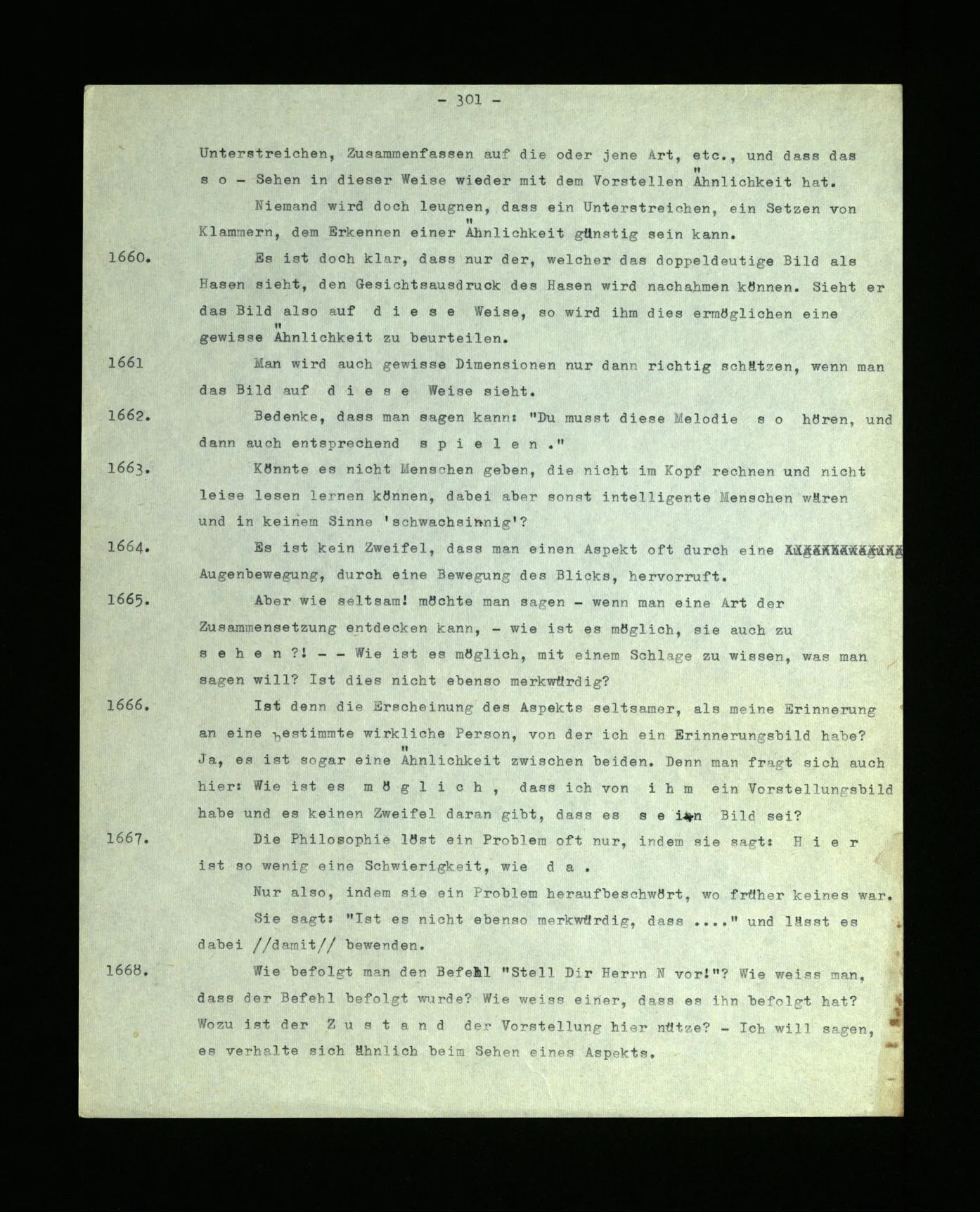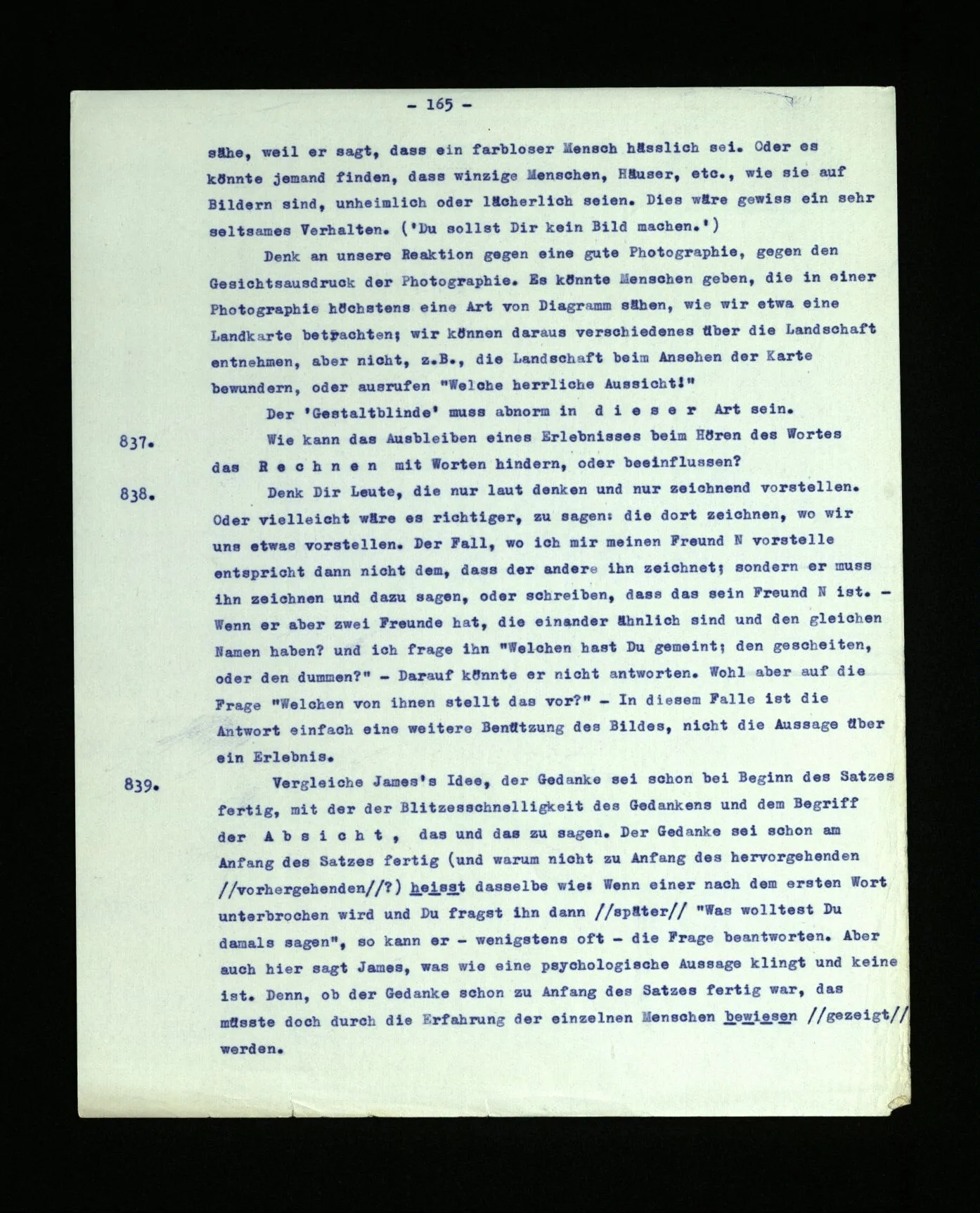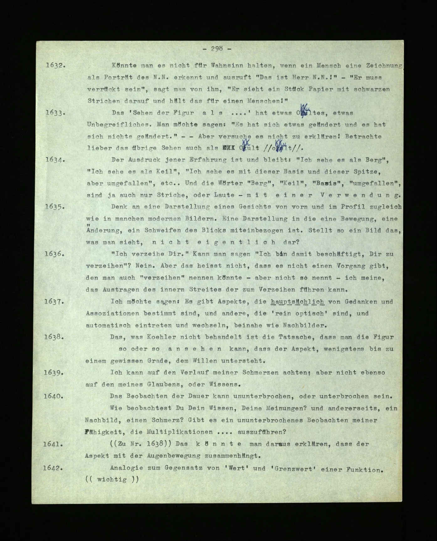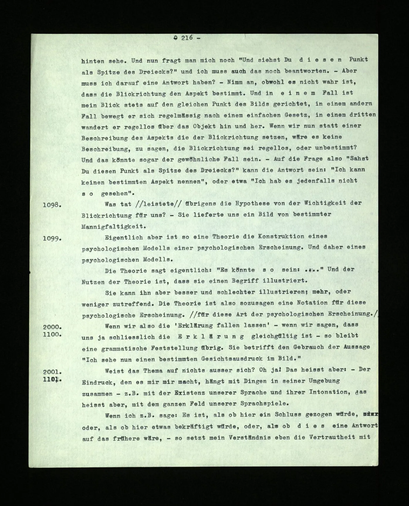 1768. “Wenn Du nur von Deinen physiologischen Vorurteilen wegkommst, wirst Du garnichts daran finden, daß das Blicken des Auges auch gesehen werden kann.” Ich sage ja auch, ich sehe den Blick, den Du dem Andern zuwirfst. Und wollte man mich verbessern und sagen, ich sähe ihn eigentlich nicht, so hielte ich das für eine Dummheit. Anderseits habe ich mit meiner Redeweise nicht etwas zugegeben,, und ich widerspreche dem, der mir sagt, ich sähe den Blick ‘geradeso’ wie die Gestalt und Farbe des Auges. Denn das ‘naive Sprechen’, d.h. unsere naive, normale, Ausdrucksweise, enthält ja keine Theorie des Sehens – zeigt Dir keine Theorie, sondern nur einen Begriff des Sehens.
