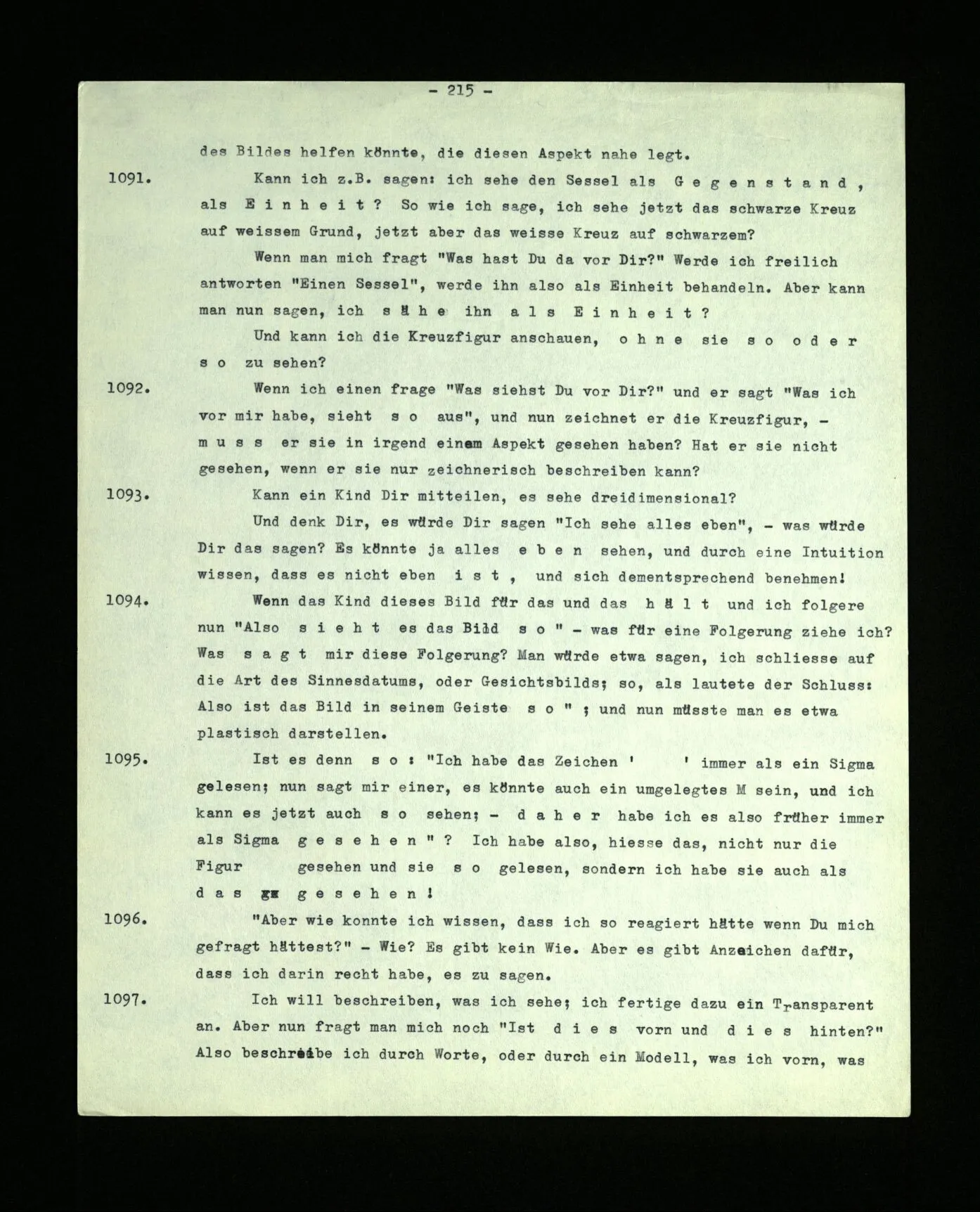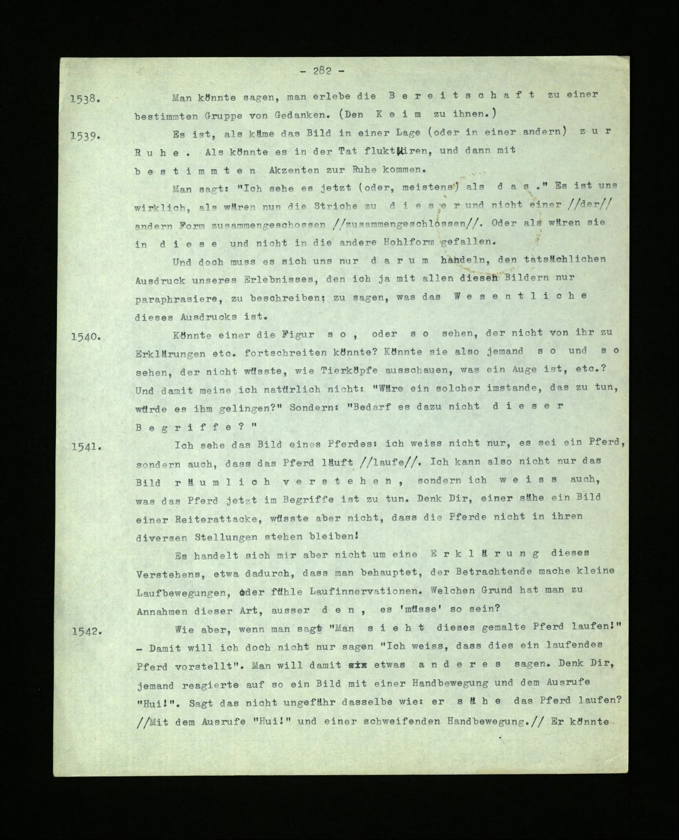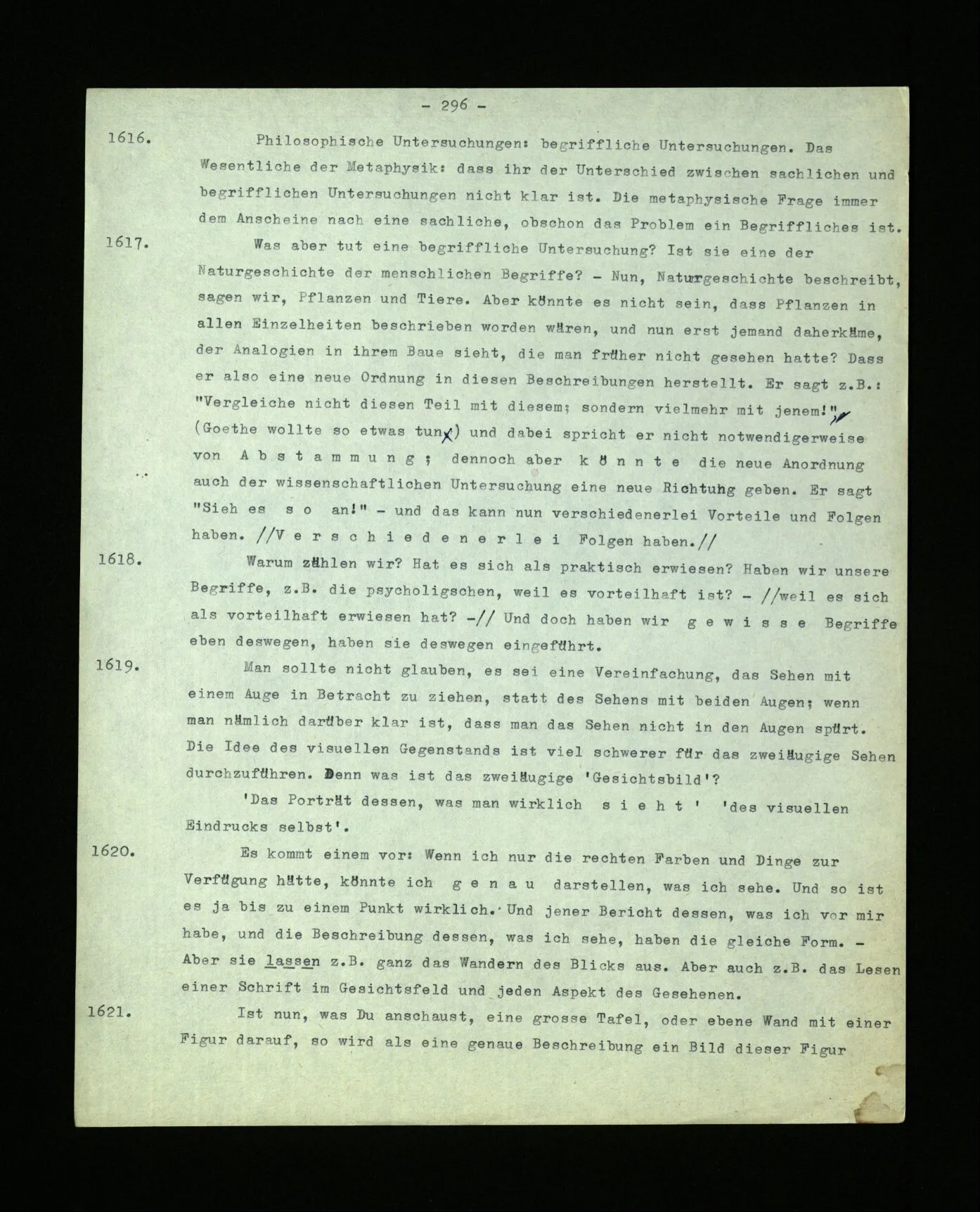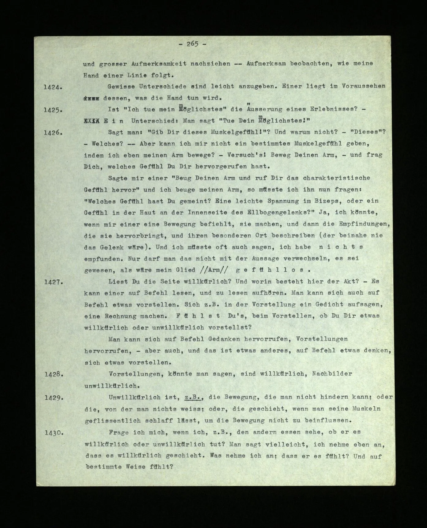 1768. “Wenn Du nur von Deinen physiologischen Vorurteilen wegkommst, wirst Du garnichts daran finden, daß das Blicken des Auges auch gesehen werden kann.” Ich sage ja auch, ich sehe den Blick, den Du dem Andern zuwirfst. Und wollte man mich verbessern und sagen, ich sähe ihn eigentlich nicht, so hielte ich das für eine Dummheit. Anderseits habe ich mit meiner Redeweise nicht etwas zugegeben,, und ich widerspreche dem, der mir sagt, ich sähe den Blick ‘geradeso’ wie die Gestalt und Farbe des Auges. Denn das ‘naive Sprechen’, d.h. unsere naive, normale, Ausdrucksweise, enthält ja keine Theorie des Sehens – zeigt Dir keine Theorie, sondern nur einen Begriff des Sehens.
