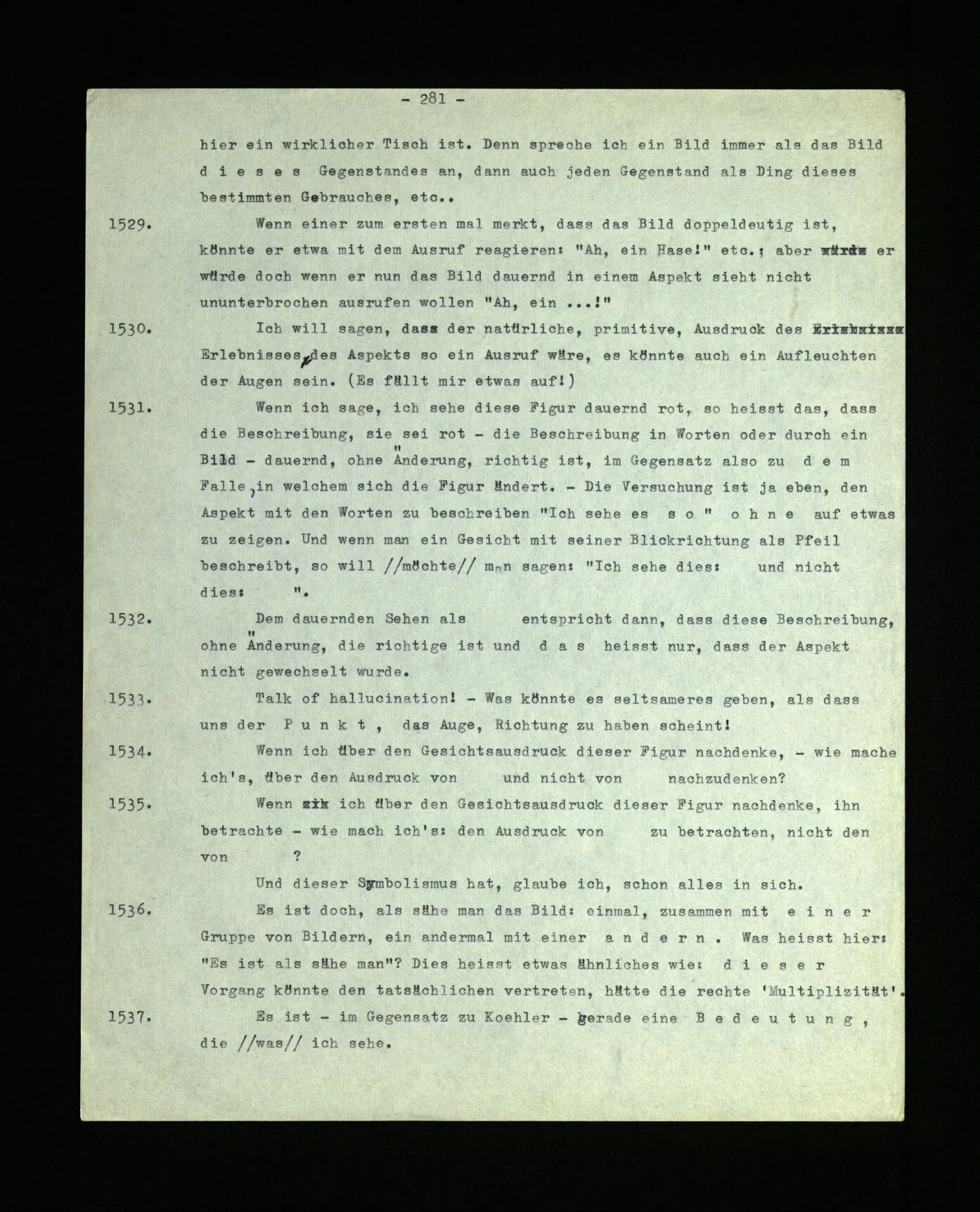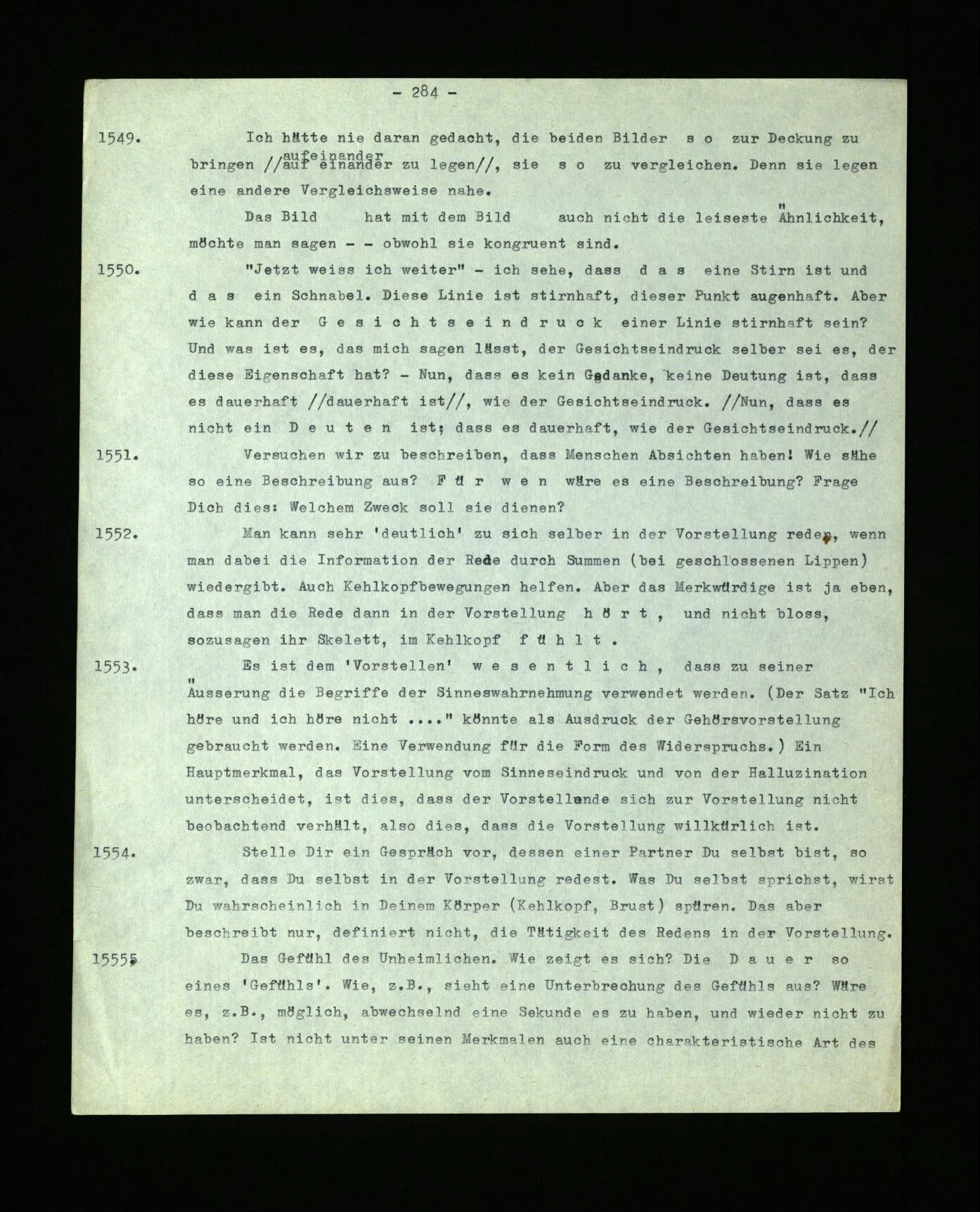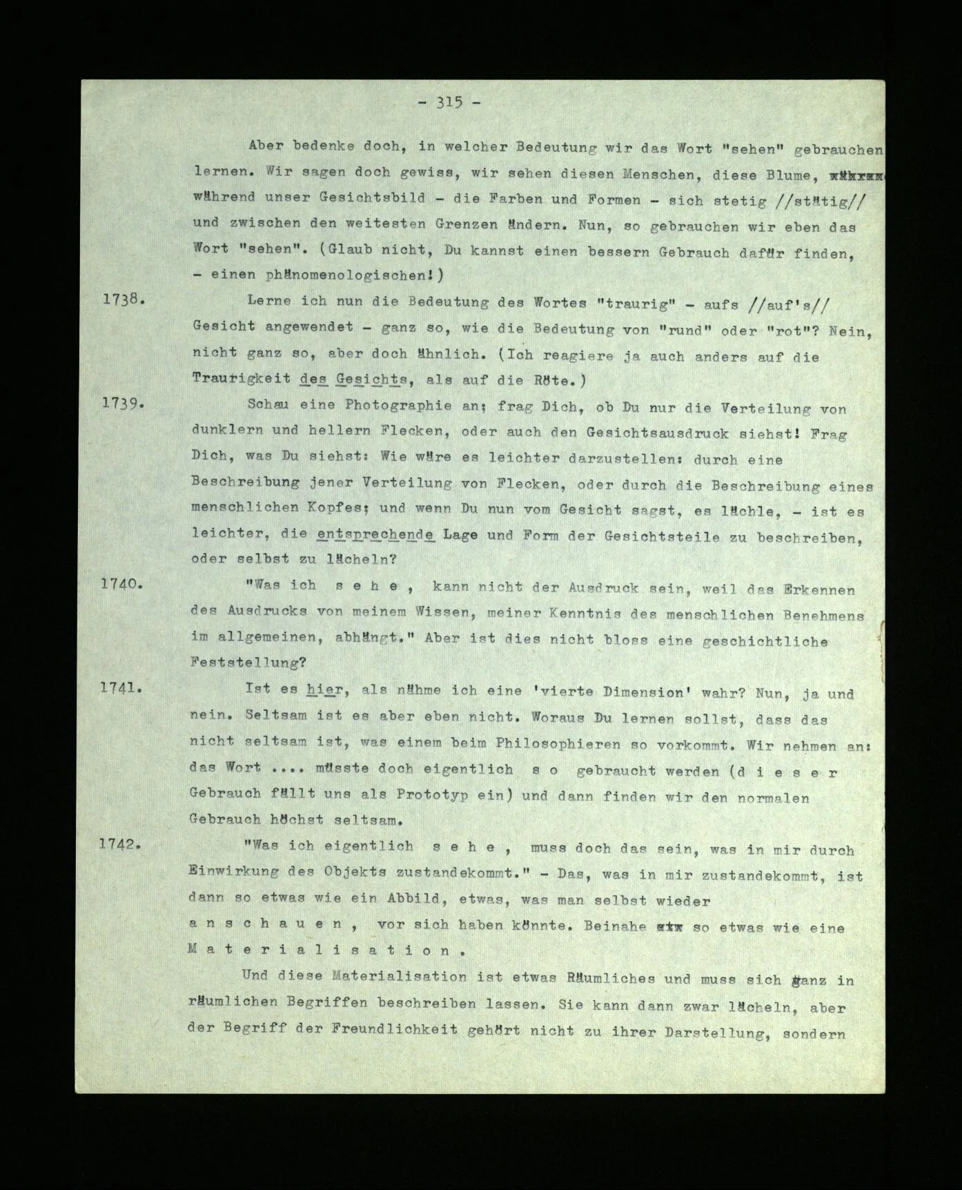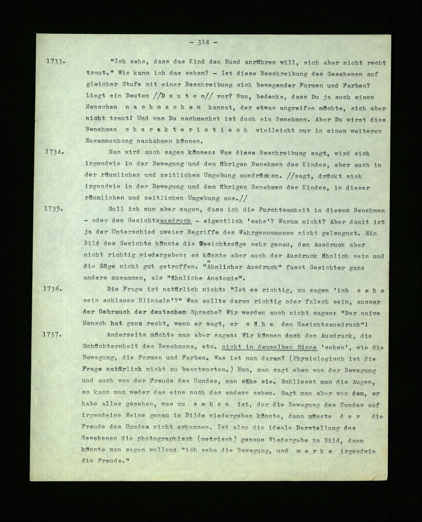 1769. Und wenn Einer sagt “Ich sehe eigentlich nicht das Blicken, sondern nur Formen und Farben”, – widerspricht der der naiven Ausdrucksweise? Sagt er, der war im Unrecht, der sagte, er habe meinen Blick wohl gesehen, gesehen, daß dieses Menschen Augen starren, ins Leere blicken, etc.? Doch gewiß nicht. Was wollte also der Purist tun? Will er sagen, es sei richtiger, hier ein anderes Wort statt des Wortes “sehen” zu gebrauchen? Ich glaube, er will nur auf eine Scheide zwischen Begriffen aufmerksam machen. Wie stellt denn das Wort “sehen” die Wahrnehmungen zusammen? Ich meine: es kann sie zusammennehmen als Wahrnehmungen mit dem Auge; denn wir spüren ja das Sehen nicht im Auge. Aber eigentlich scheint der, der auf der Richtigkeit unserer normalen Ausdrucksweise besteht, zu sagen: daß im Gesichtseindruck das alles enthalten sei; daß das subjektive Auge sowohl Form als Farbe, als Bewegung, als Ausdruck und Blick (Richtung nach außen) habe. Daß man den Blick, sozusagen, nicht woanders spürt. Aber das heißt nicht: ‘woanders als in den Augen’, sondern: woanders als im Gesichtsbild. Aber wie wäre es denn, wenn’s anders wäre? Etwa so, daß ich sagte: “Ich sehe in diesem Auge die und die Formen, Farben, Bewegungen, – das heißt, es blickt jetzt freundlich”, als zöge ich also einen Schluß. – Man könnte also sagen: Der Ort des wahrgenommenen Blickes ist das subjektive Auge, das Gesichtsbild des Auges, selber.