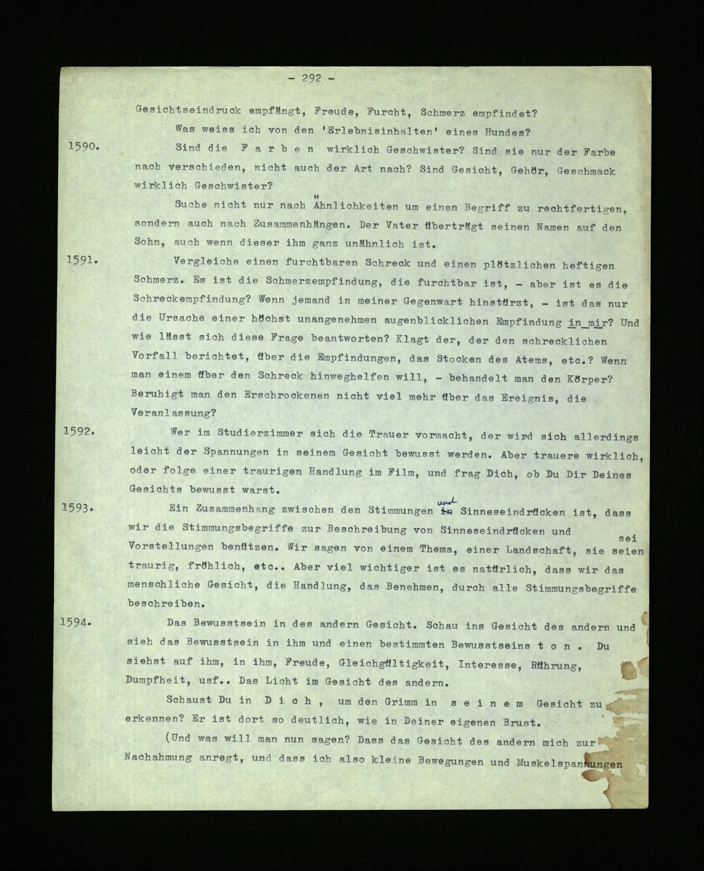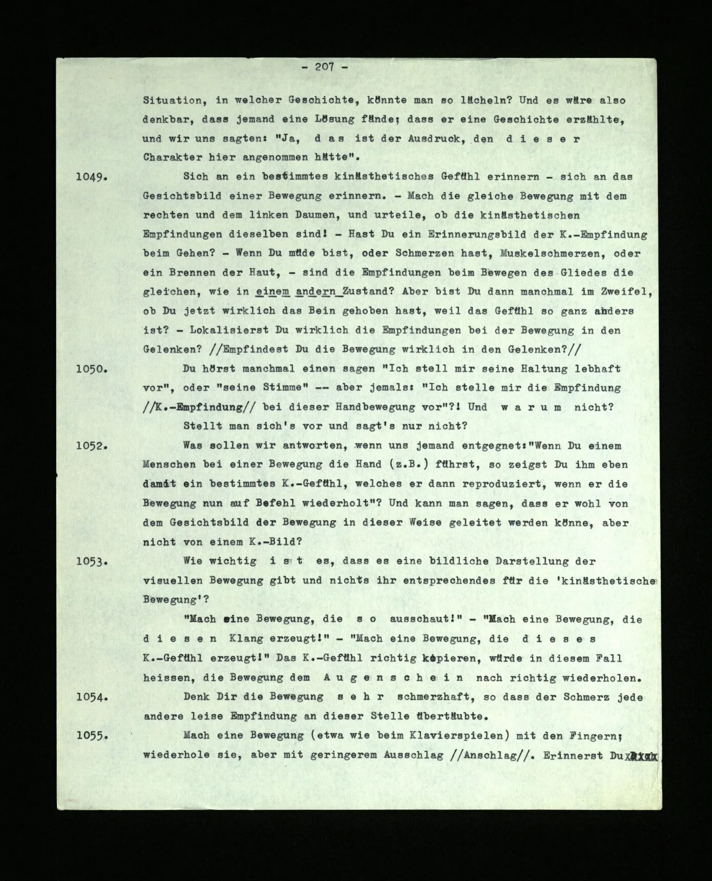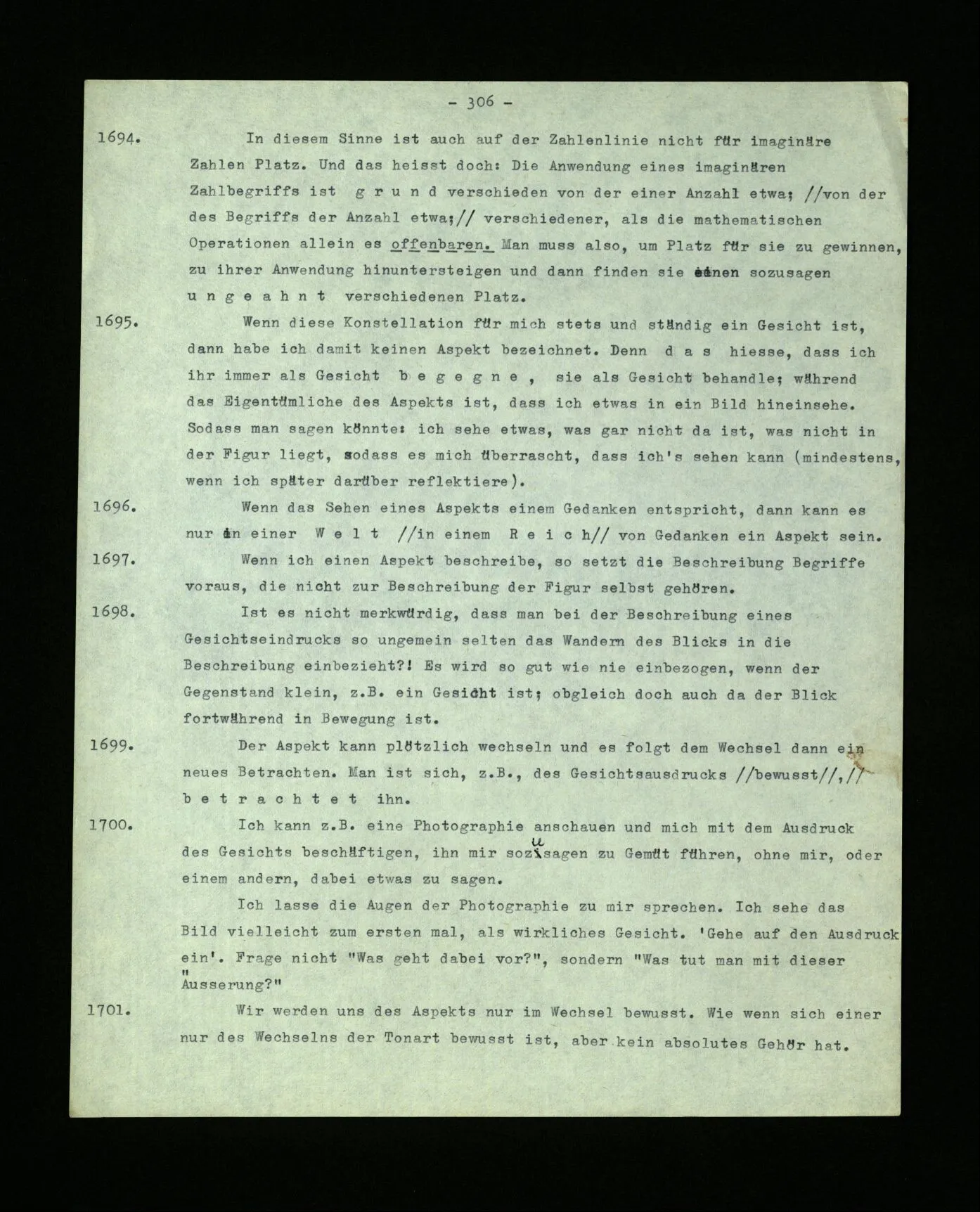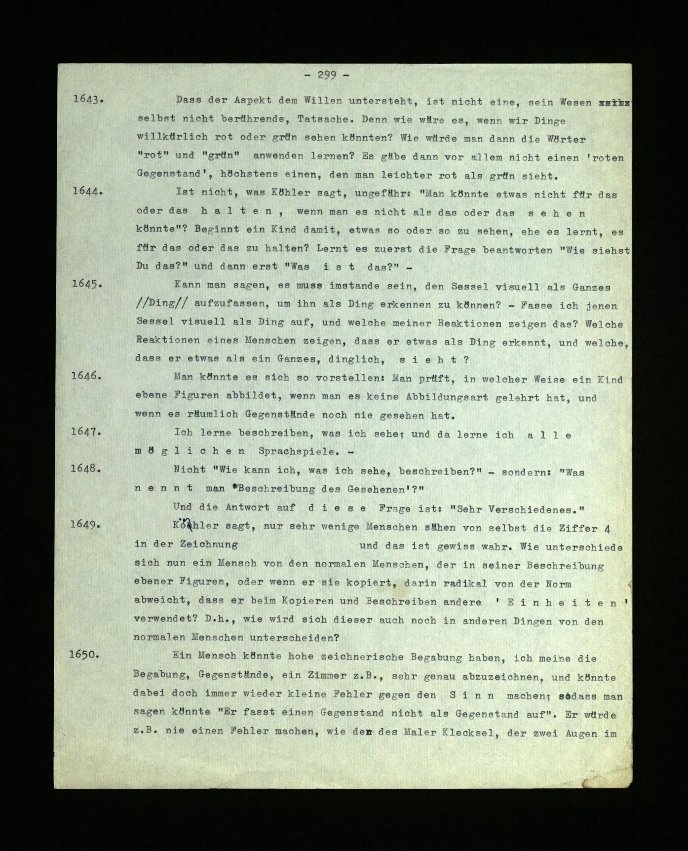 1769. Und wenn Einer sagt “Ich sehe eigentlich nicht das Blicken, sondern nur Formen und Farben”, – widerspricht der der naiven Ausdrucksweise? Sagt er, der war im Unrecht, der sagte, er habe meinen Blick wohl gesehen, gesehen, daß dieses Menschen Augen starren, ins Leere blicken, etc.? Doch gewiß nicht. Was wollte also der Purist tun? Will er sagen, es sei richtiger, hier ein anderes Wort statt des Wortes “sehen” zu gebrauchen? Ich glaube, er will nur auf eine Scheide zwischen Begriffen aufmerksam machen. Wie stellt denn das Wort “sehen” die Wahrnehmungen zusammen? Ich meine: es kann sie zusammennehmen als Wahrnehmungen mit dem Auge; denn wir spüren ja das Sehen nicht im Auge. Aber eigentlich scheint der, der auf der Richtigkeit unserer normalen Ausdrucksweise besteht, zu sagen: daß im Gesichtseindruck das alles enthalten sei; daß das subjektive Auge sowohl Form als Farbe, als Bewegung, als Ausdruck und Blick (Richtung nach außen) habe. Daß man den Blick, sozusagen, nicht woanders spürt. Aber das heißt nicht: ‘woanders als in den Augen’, sondern: woanders als im Gesichtsbild. Aber wie wäre es denn, wenn’s anders wäre? Etwa so, daß ich sagte: “Ich sehe in diesem Auge die und die Formen, Farben, Bewegungen, – das heißt, es blickt jetzt freundlich”, als zöge ich also einen Schluß. – Man könnte also sagen: Der Ort des wahrgenommenen Blickes ist das subjektive Auge, das Gesichtsbild des Auges, selber.