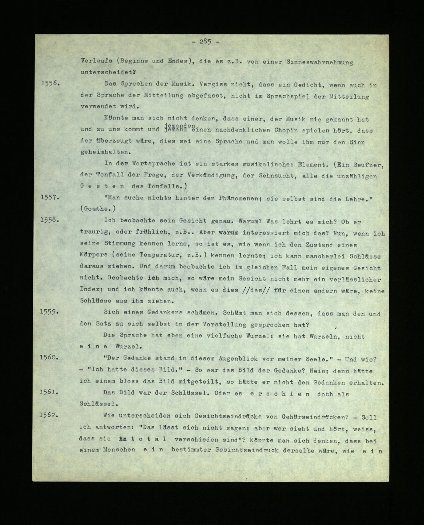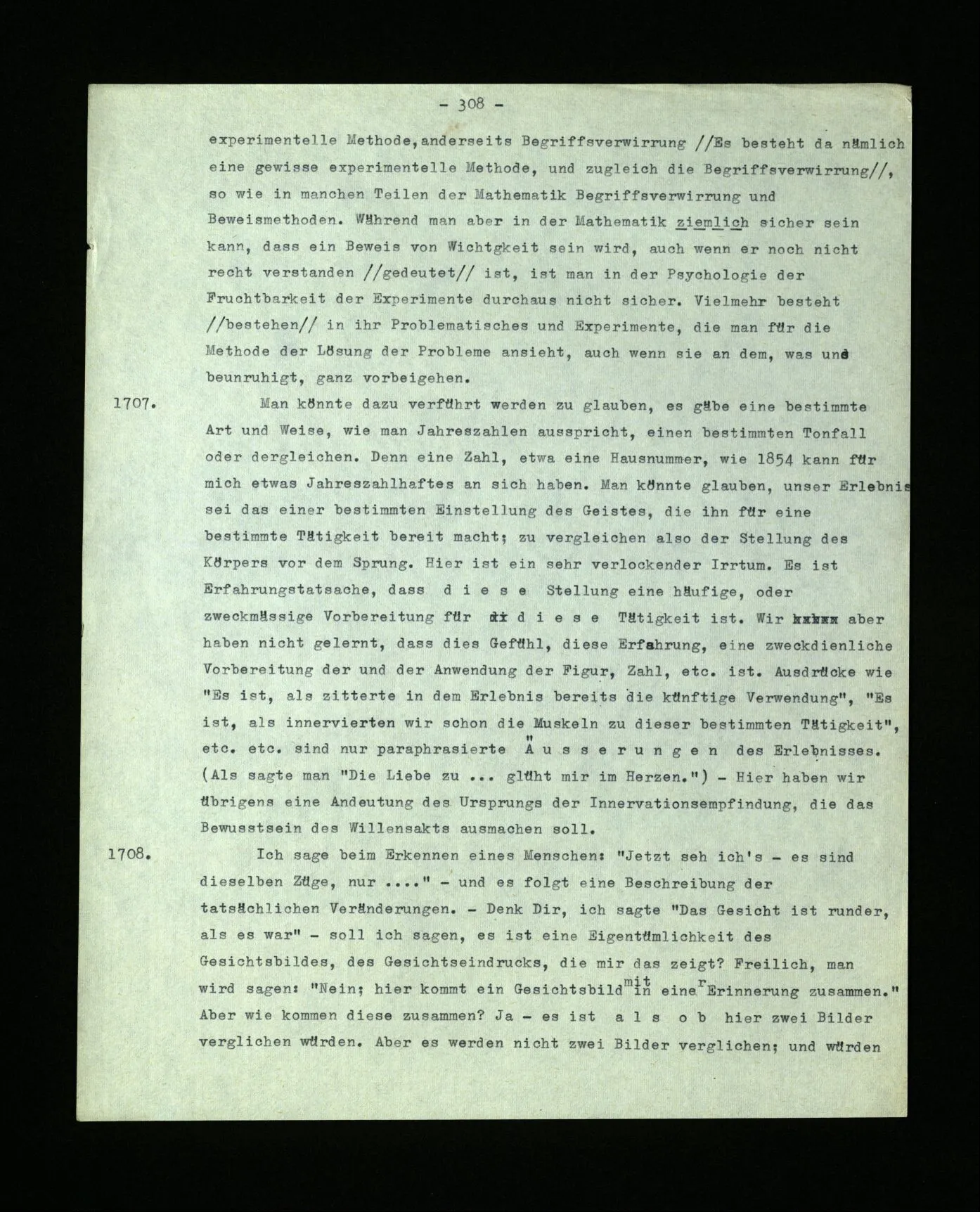 718. Das vertraute Gesicht eines Wortes; die Empfindung, ein Wort sei gleichsam ein Bild seiner Bedeutung; es habe seine Bedeutung in sich aufgenommen – es kann eine Sprache geben, der das alles fremd ist. Und wie drücken sich diese Empfindungen bei uns aus? Darin, wie wir Worte wählen und schätzen. ((Goethe über Personennamen. If-Feeling.))