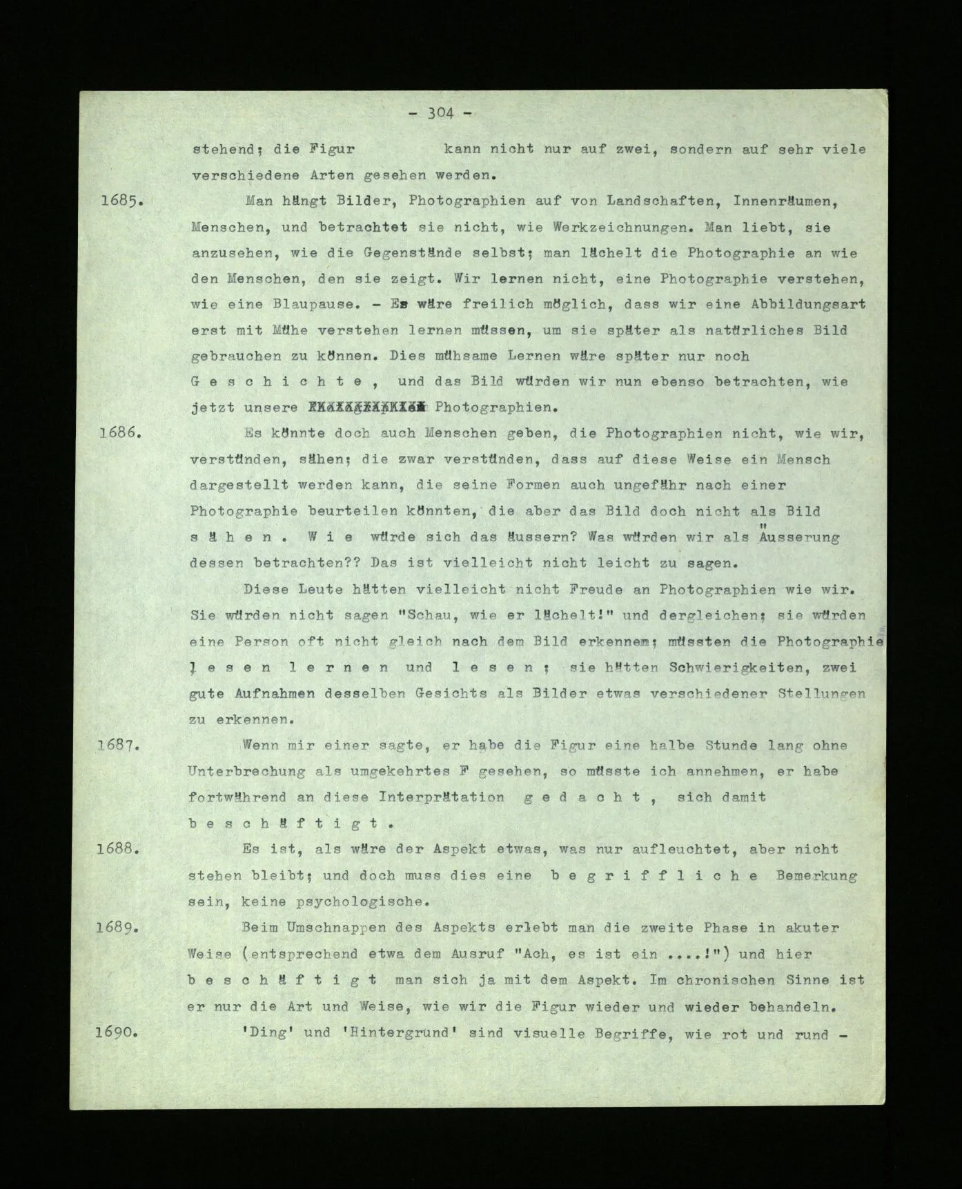 1778. Wie sieht die Beschreibung einer ‘Einstellung’ aus? Man sagt z.B.: “Sieh von diesen Flecken ab und auch von dieser kleinen Unregelmäßigkeit, und schau es als Bild eines ‥‥ an!” “Denk Dir das weg! Wär’s Dir auch ohne dieses ‥‥ unangenehm?” Man wird doch sagen, ich ändere mein Gesichtsbild – wie durch Blinzeln, oder Weghalten eines Details. Dieses “Absehen von ‥․” spielt doch eine ganz ähnliche Rolle, wie etwa die Anfertigung eines neuen Bildes.