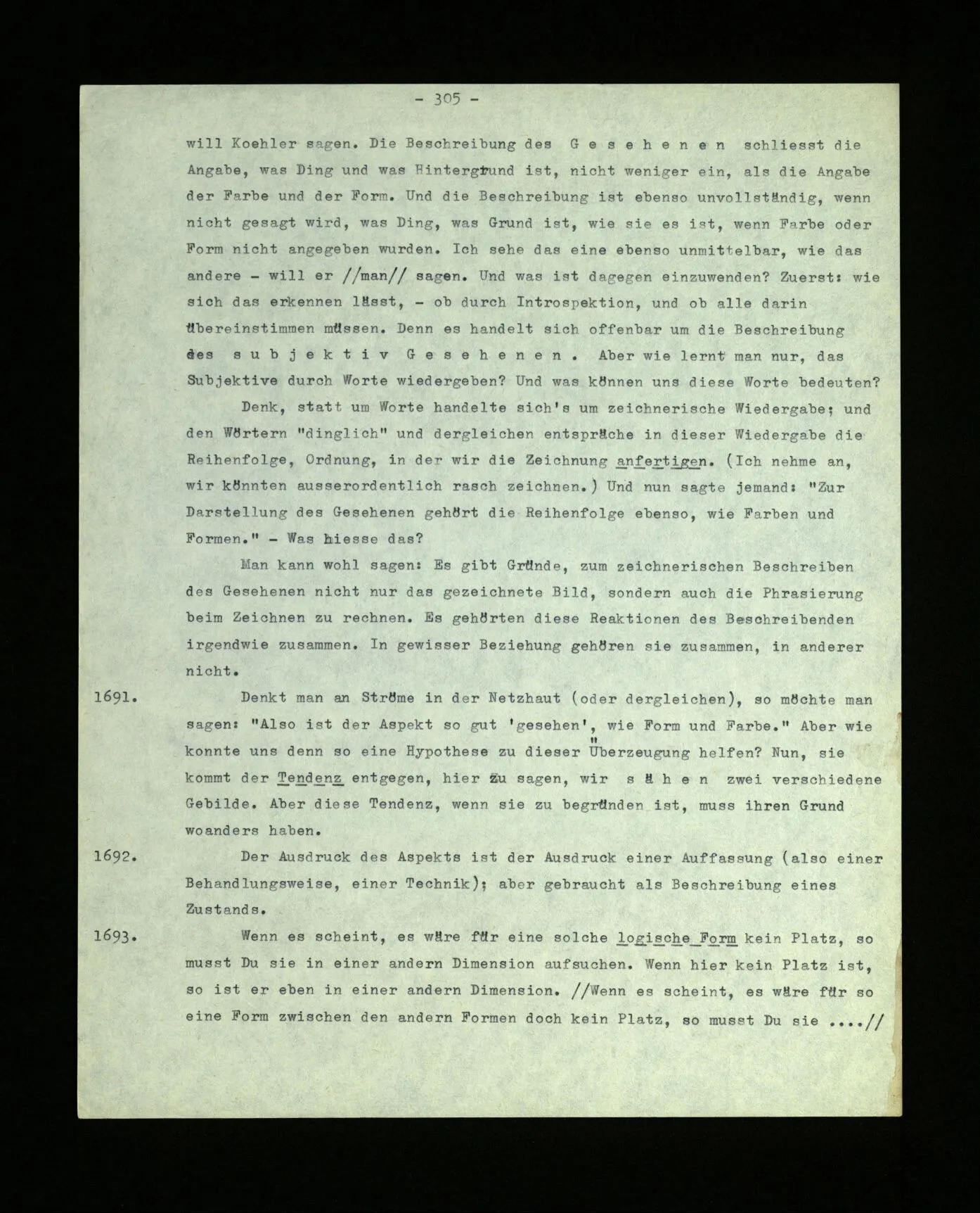 697. Ich bin mir, wenn ich die Gegenstände um mich her betrachte, nicht bewußt, daß es so etwas wie eine visuelle Auffassung gibt.