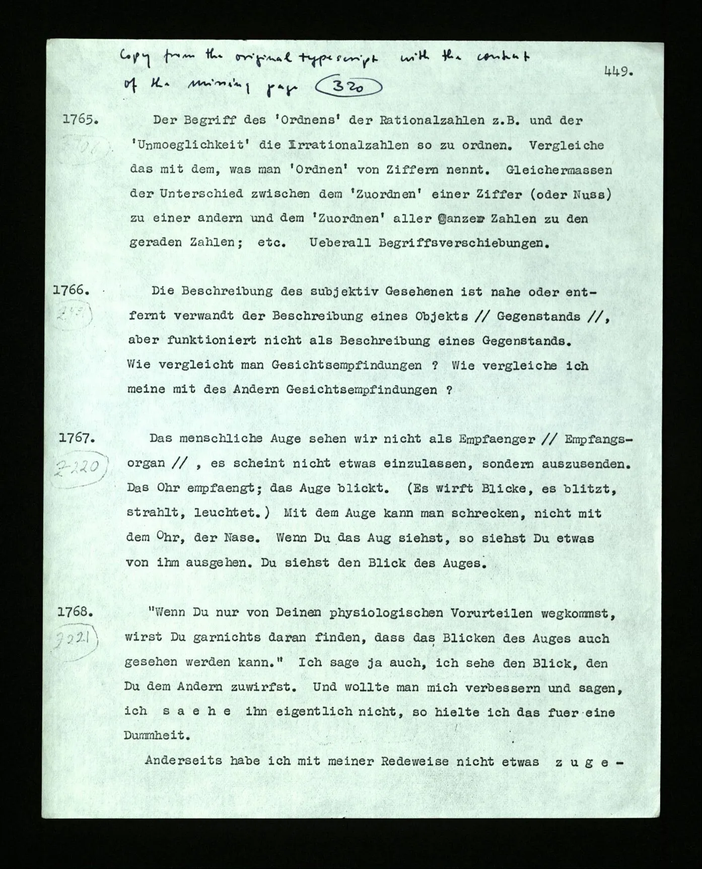 1765. Der Begriff des ‘Ordnens’ der Rationalzahlen z.B. und der ‘Unmöglichkeit’ die Irrationalzahlen so zu ordnen. Vergleiche das mit dem, was man ‘Ordnen’ von Ziffern nennt. Gleichermaßen der Unterschied zwischen dem ‘Zuordnen’ einer Ziffer (oder Nuß) zu einer andern und dem ‘Zuordnen’ aller ganzer Zahlen zu den geraden Zahlen; etc. Überall Begriffsverschiebungen.
