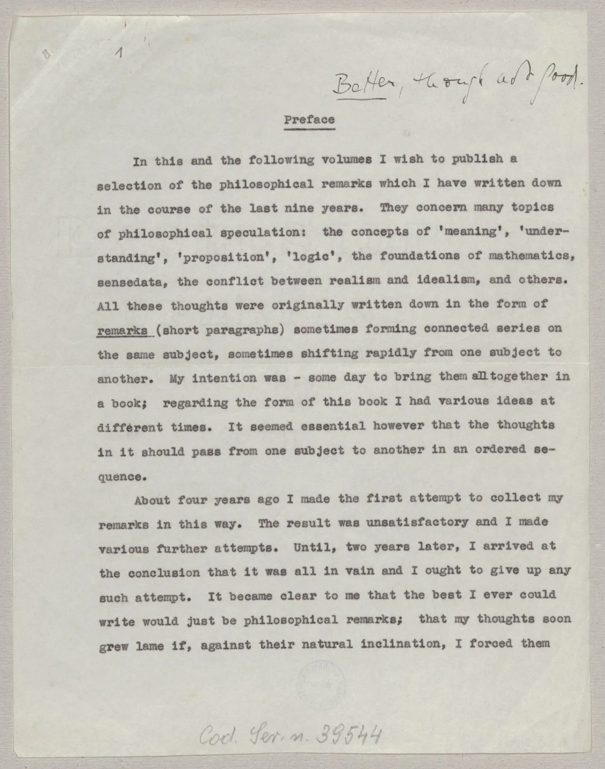In this and the following volumes I wish to publish a selection of the philosophical remarks which I have written down in the course of the last nine years. They concern many topics of philosophical speculation: the concepts of ‘meaning’, ‘understanding’, ‘proposition’, ‘logic’, the foundations of mathematics, sensedata, the conflict between realism and idealism, and others. All these thoughts were originally written down in the form of remarks (short paragraphs) sometimes forming connected series on the same subject, sometimes shifting rapidly from one subject to another. My intention was – some day to bring them all together in a book; regarding the form of this book I had various ideas at different times. It seemed essential however that the thoughts in it should pass from one subject to another in an ordered sequence.