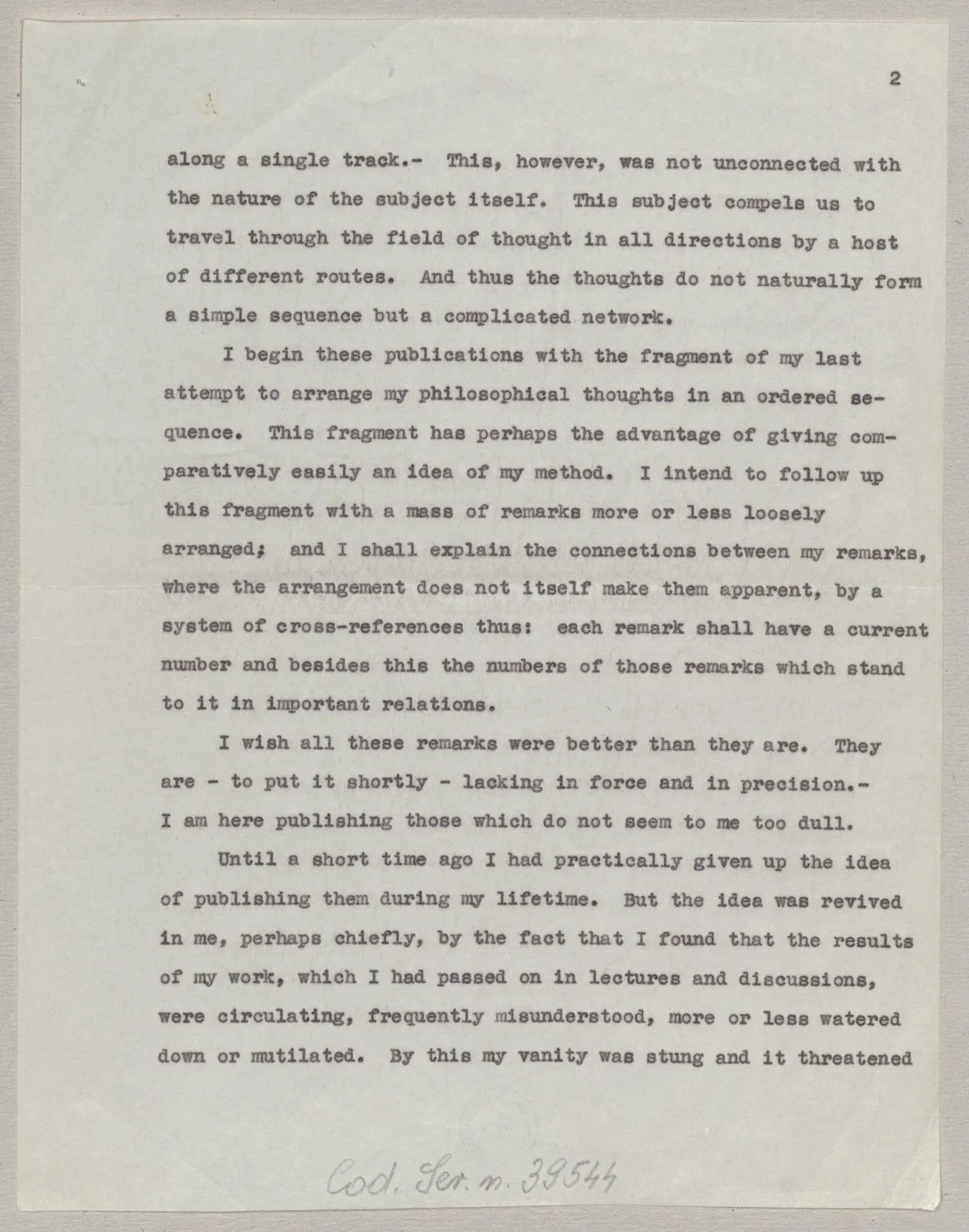 I begin these publications with the fragment of my last attempt to arrange my philosophical thoughts in an ordered sequence. This fragment has perhaps the advantage of giving comparatively easily an idea of my method. I intend to follow up this fragment with a mass of remarks more or less loosely arranged; and I shall explain the connections between my remarks, where the arrangement does not itself make them apparent, by a system of cross-references thus: each remark shall have a current number and besides this the numbers of those remarks which stand to it in important relations.