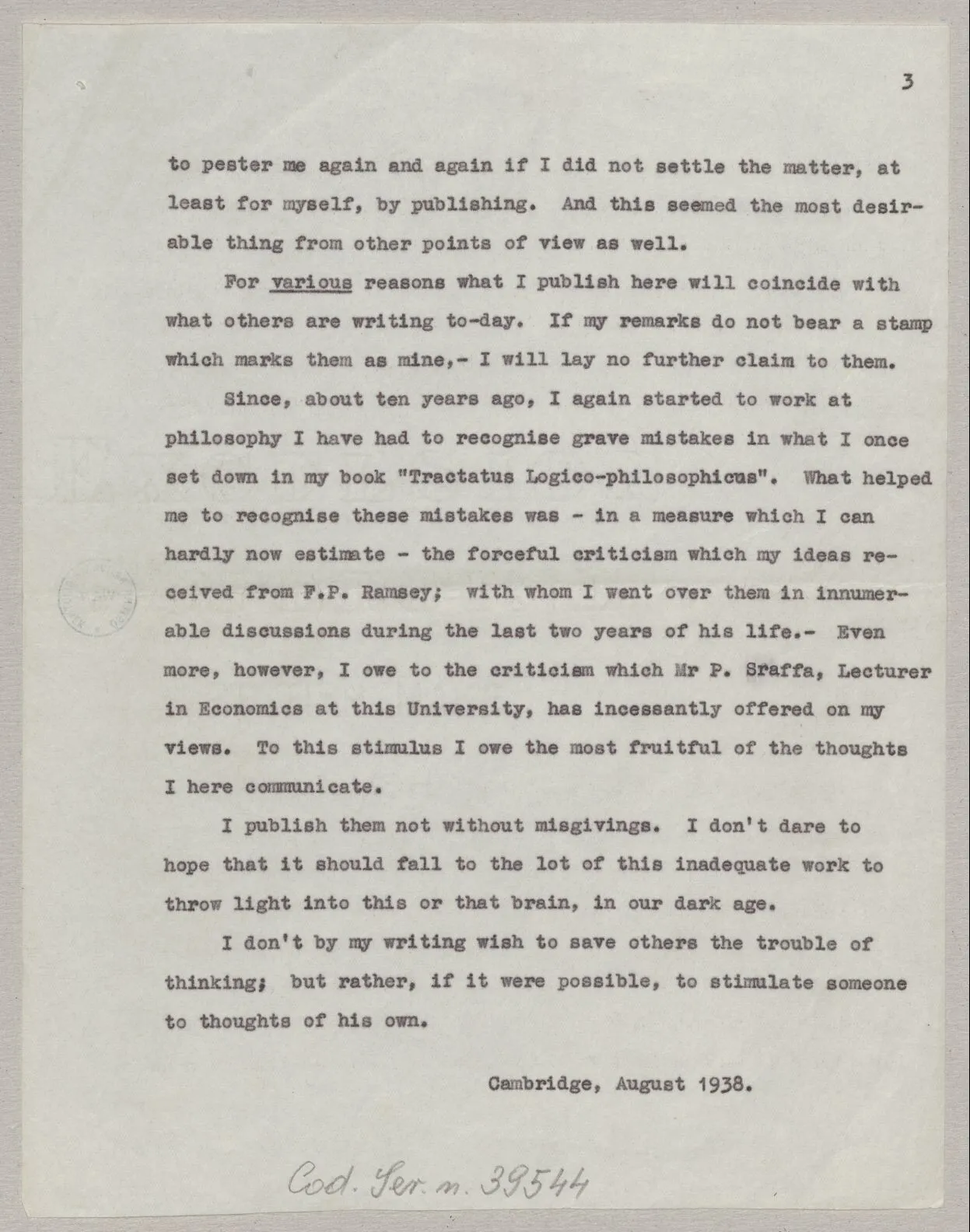 Since, about ten years ago, I again started to work at philosophy I have had to recognise grave mistakes in what I once set down in my book “Tractatus Logico-philosophicus”. What helped me to recognise these mistakes was – in a measure which I can hardly now estimate – the forceful criticism which my ideas received from F.P. Ramsey; with whom I went over them in innumerable discussions during the last two years of his life.– Even more, however, I owe to the criticism which Mr P. Sraffa, Lecturer in Economics at this University, has incessantly offered on my views. To this stimulus I owe the most fruitful of the thoughts I here communicate.